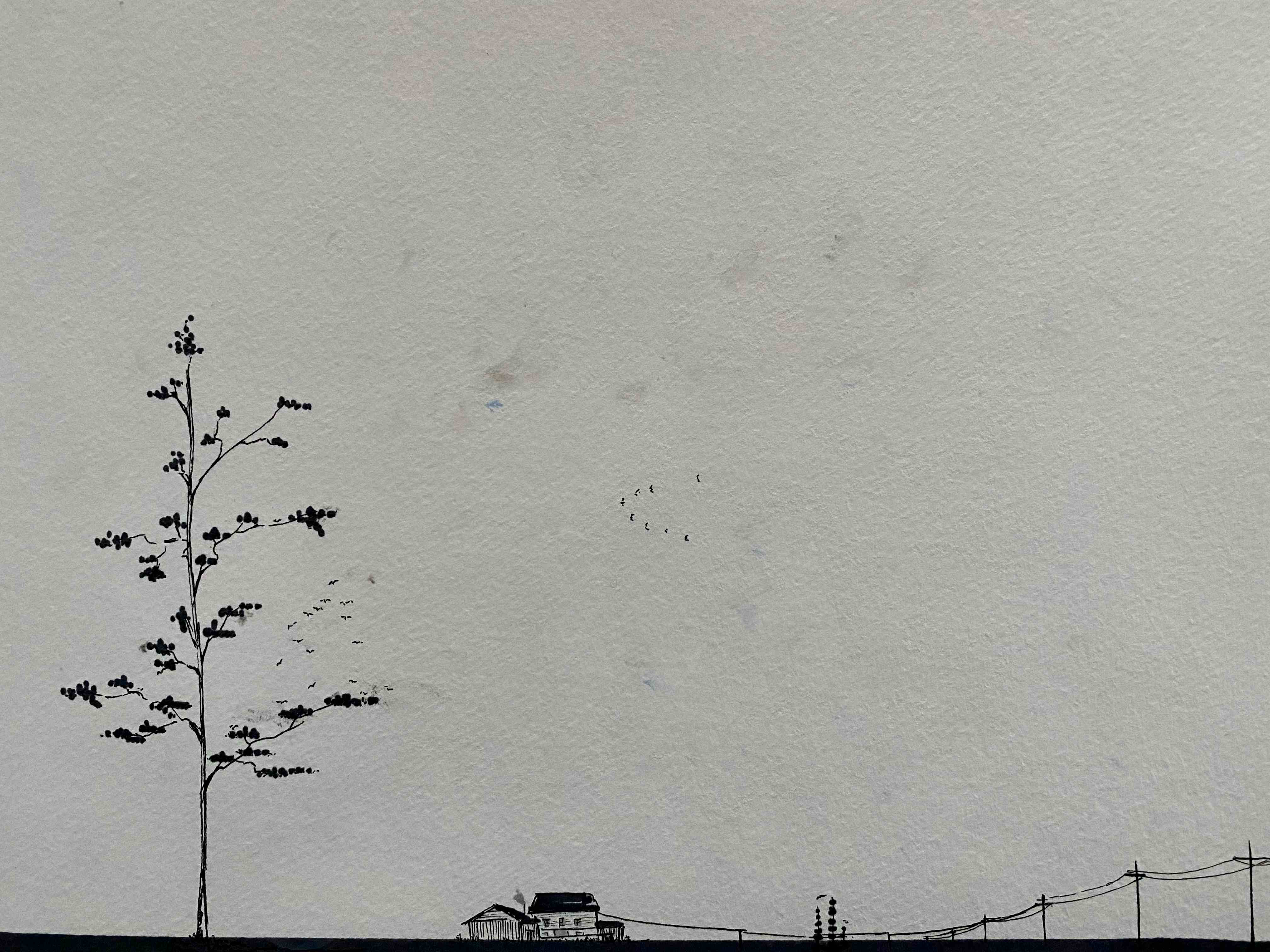 Illustrated in minimalist style, is a farmstead on a rural property, an ancient tree stands sentinel with a flock of birds rising from its branches; to the right of the painting is a telephone line with a solitary line connecting the inhabitants of the house to the rest of the world. in this space, the concept of home is tied firmly to land. The turning of crops, the smell of dirt, fresh rain, baking heat, and flat plains. The insignificance of human interaction with the land in terms of time adds to the relationship between people and nature, a stewardship of something scared, where home is a relationship with place not just a structure. Fine liner, copic markers and water colours.