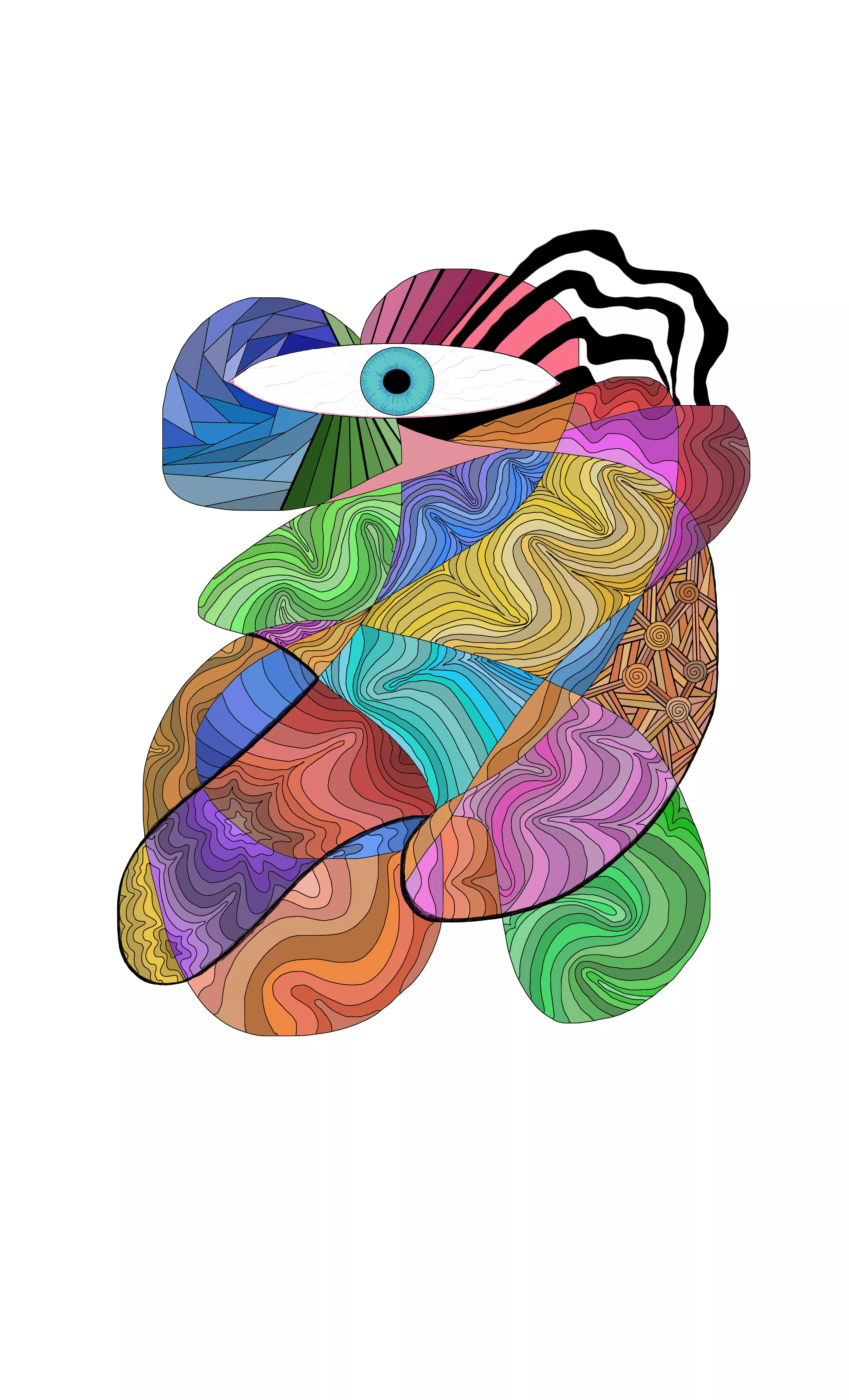 This painting shows two people hugging each other. And the colors on their bodies represent the waves of love. And a single eye on their head represents their soul connection. They are one soul in two bodies.