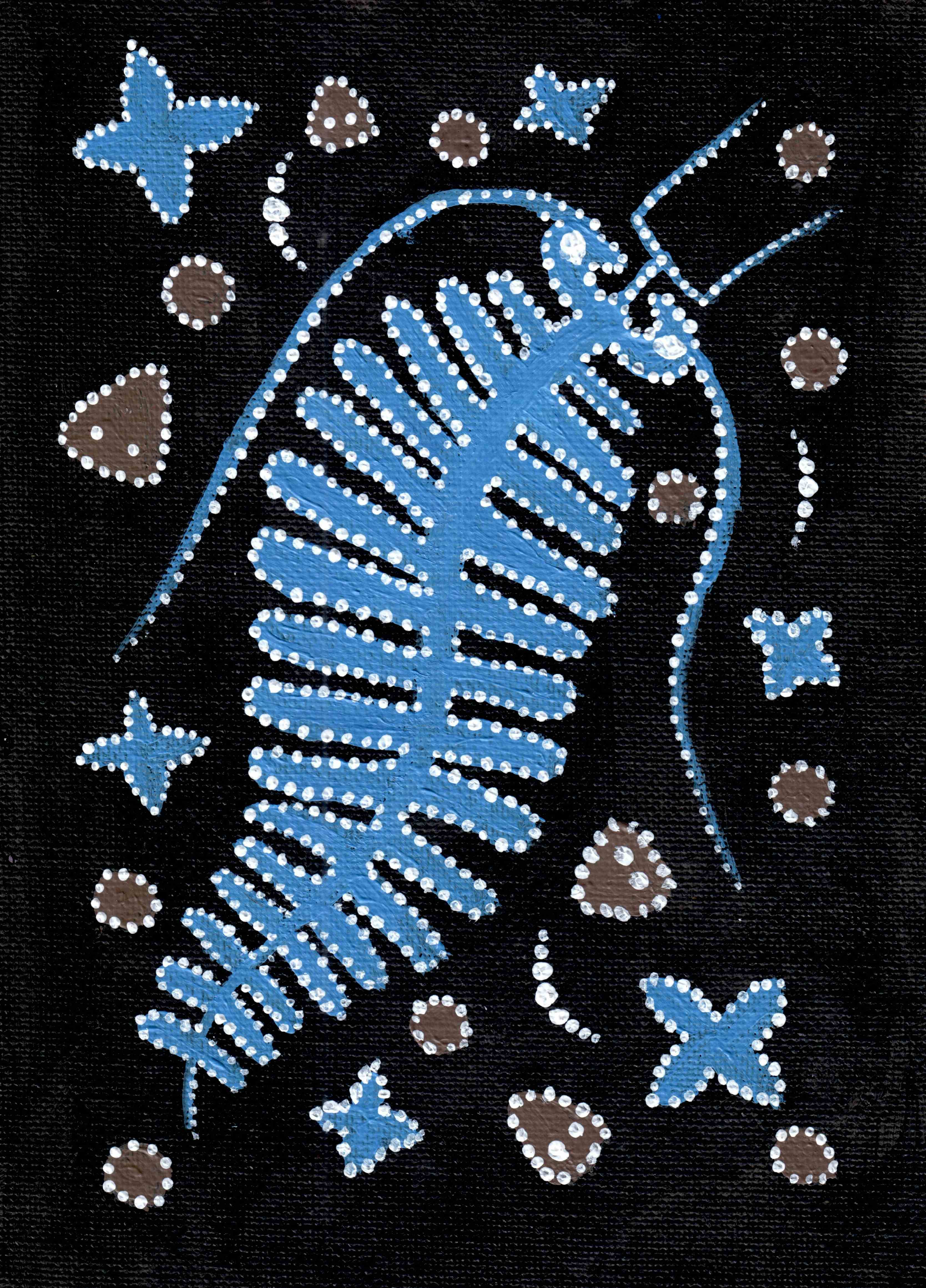 Acrylic painting on canvas 148x210 mm: Bioplankton named Planaria due to the shape. Blue colour is associated with galactic and Cosmos. This "space worm" is absolutely happy, floating and keep growing, radiating harmony and peace.