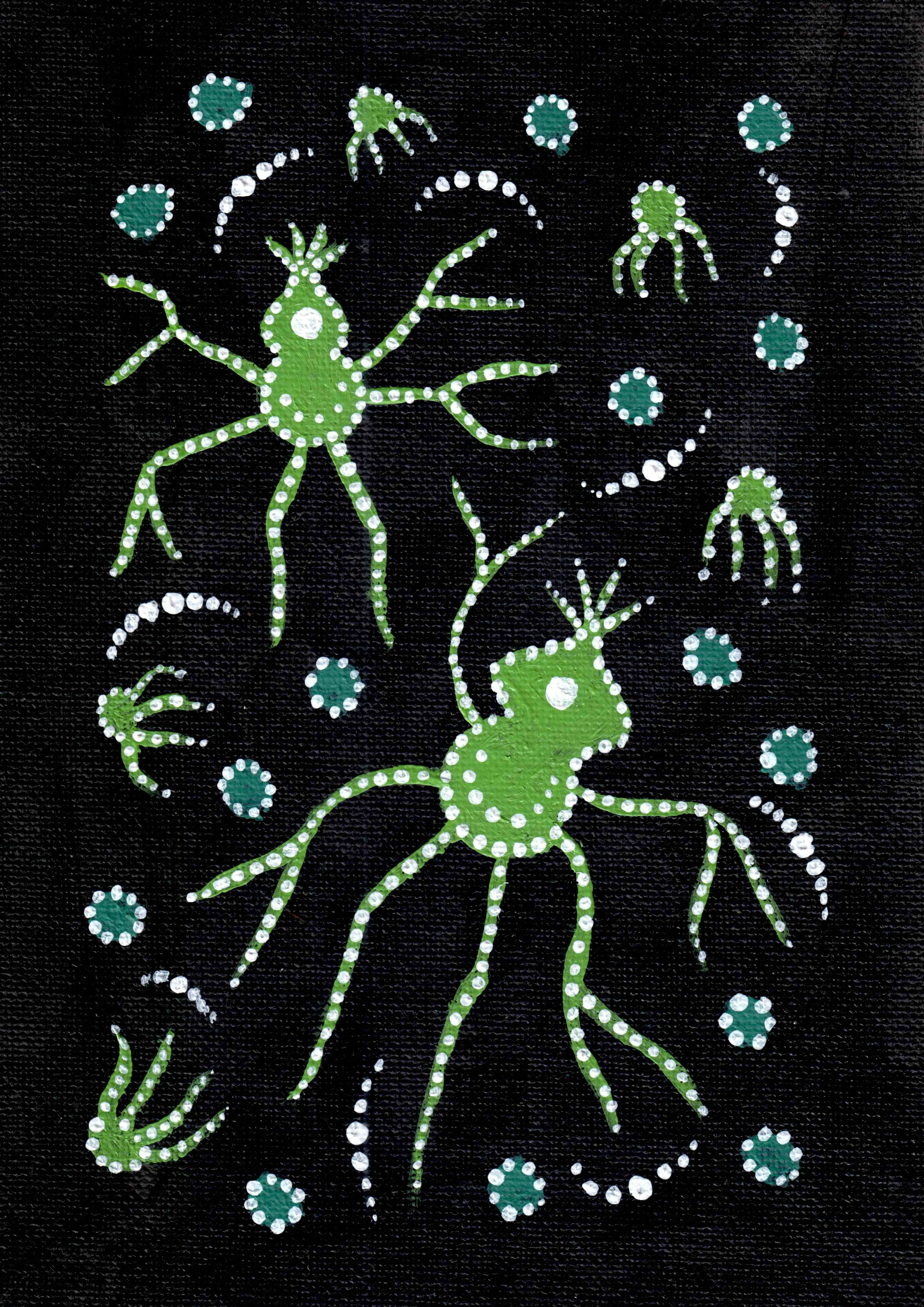 Acrylic painting on canvas 148x210 mm: Bioplankton named Spider due to its spider-like shape. Very adaptable and resilient. Green "octopus" elements are representing my respect to oceans and water environment as the source of life on the Earth.