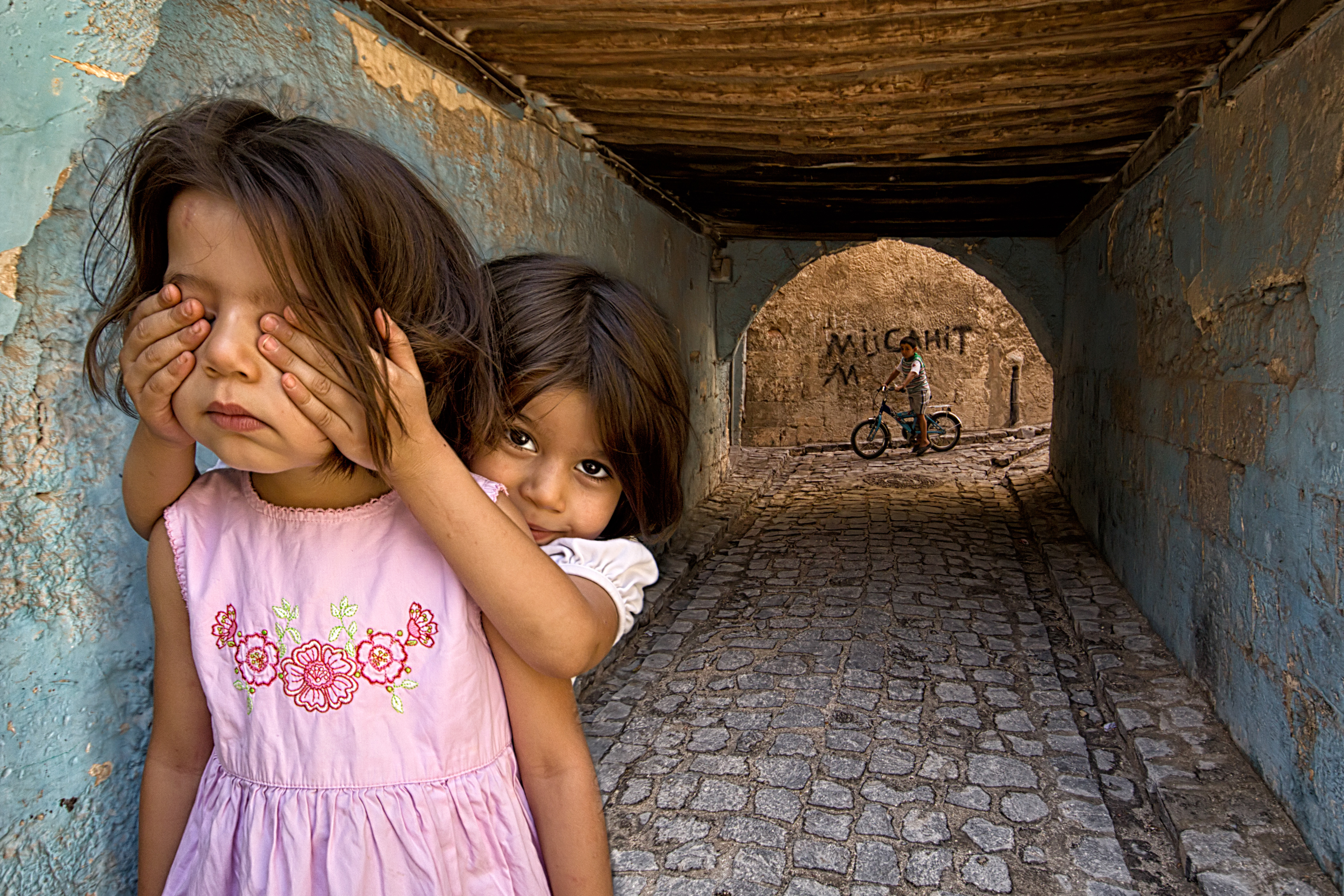 Children who know how to have fun and smile in any situation and everywhere. Children playing on the street in the Early Morning. When they saw me, they increased the dose of their mischief.