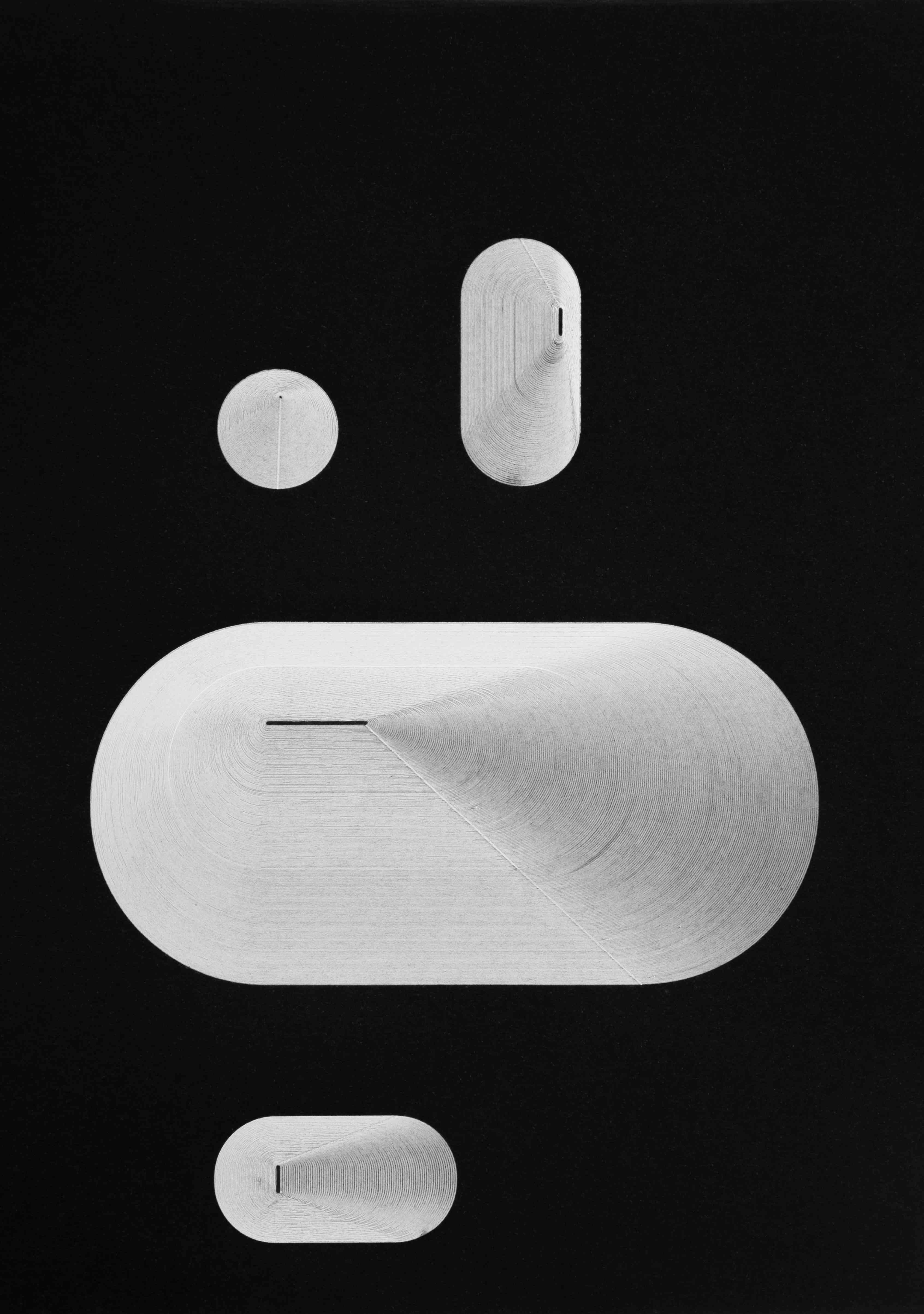 Technique Phygital. Generated using Processing IDE, mechanically plotted with an AxiDraw v3, and photographed with a digital camera. Media Fine point pen, 0.4 mm, archival quality white ink on a deep black matte, rough grain texture, acid free, 150 gsm paper Dimensions Physical: 210 x 297 mm Digital: 3384 × 4810 px