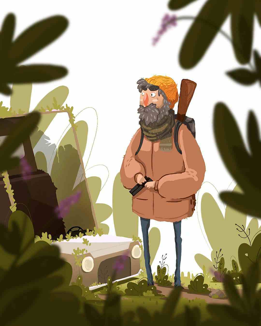 The end of everything. The world is ending and only you are left, wandering the woods looking for food and avoiding being eaten. Handmade. Simple but wonderful