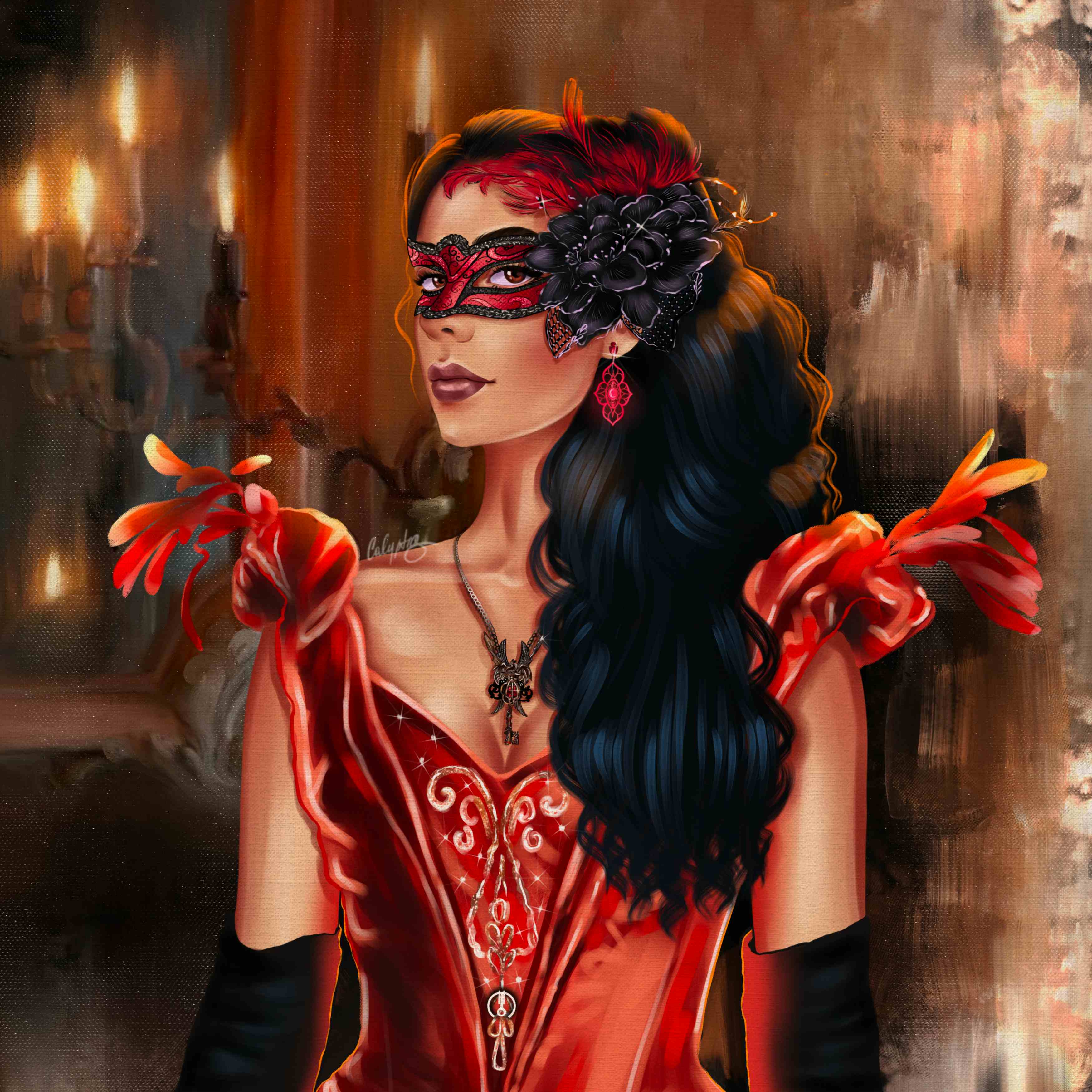Across the hall, to the resounding laughter of ladies in sequined dresses, champagne is flowing and the crystal reflects their jewelry more brilliantly than can be imagined. The music is so intertwined with all this boisterous and unrestrained merriment that it is hardly possible to hear the men arguing about their new revolvers and the races last week... The only rule for today is a masquerade in red and black. A strict obligation to wear exactly the red mask. In all this hurricane, it's easy to run into someone and not to recognize that person... But somehow I'm sure you'll recognize one thing. The bright scarlet ruby in the dragon's paws, forged in the shape of a key, which is now around my neck...