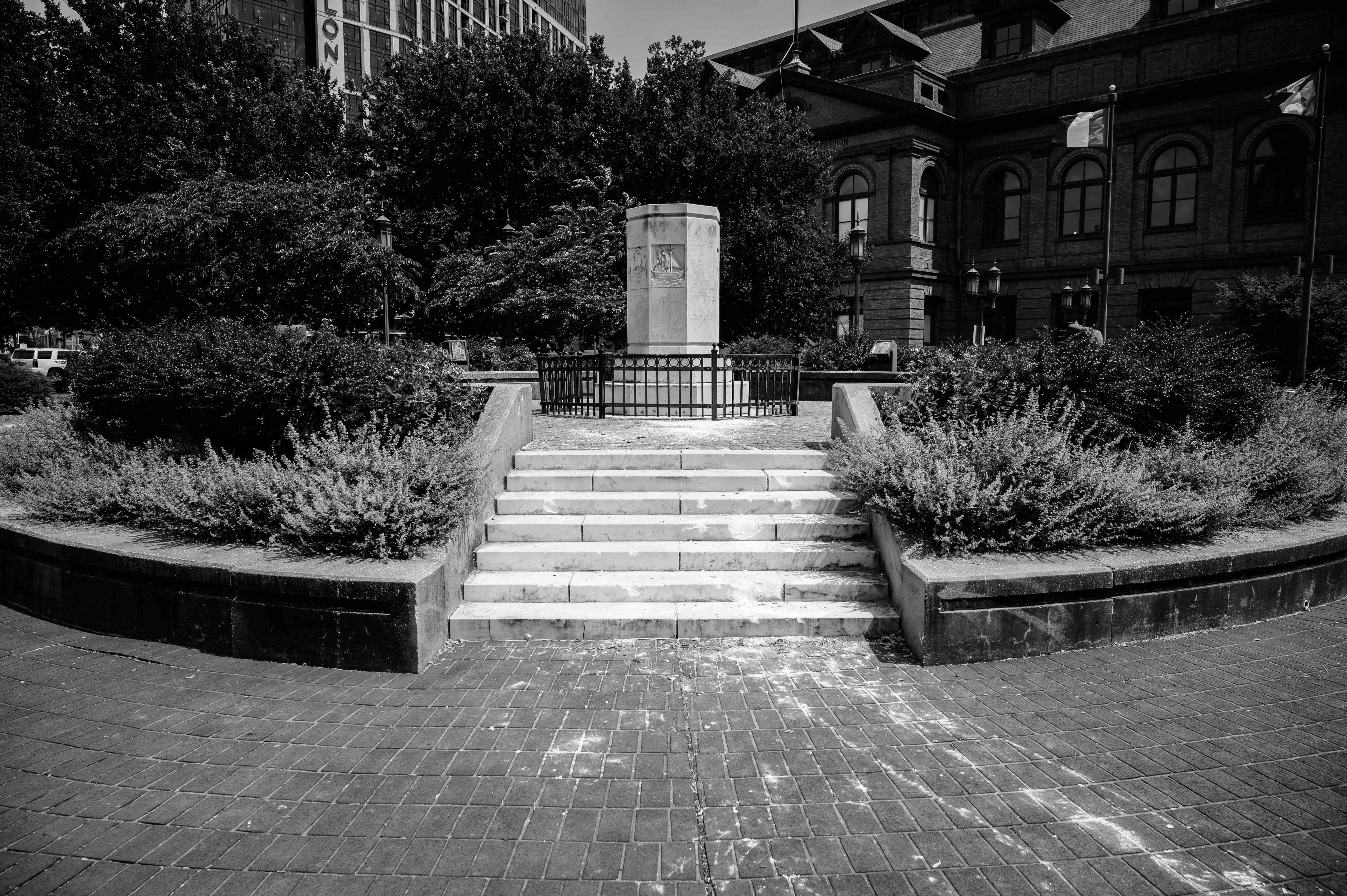 The empty plinth where Columbus once stood located in Little Italy, Baltimore, and the trail of where he went when the people spoke on July 4th, 2020.
