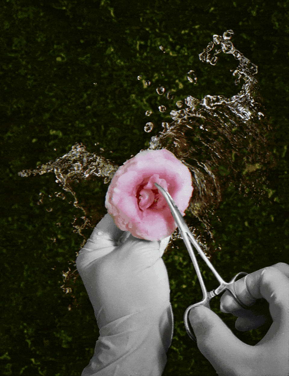 4 images loop. 960 x 1248px GIF file. Hands, flower and water were taken with nimslo 3D. nimslo 3D is a 1980s stereo film camera. It has four lenses. Taken in November 2014. The background image is computer graphics. Synthesized on a PC. Created in February 2022