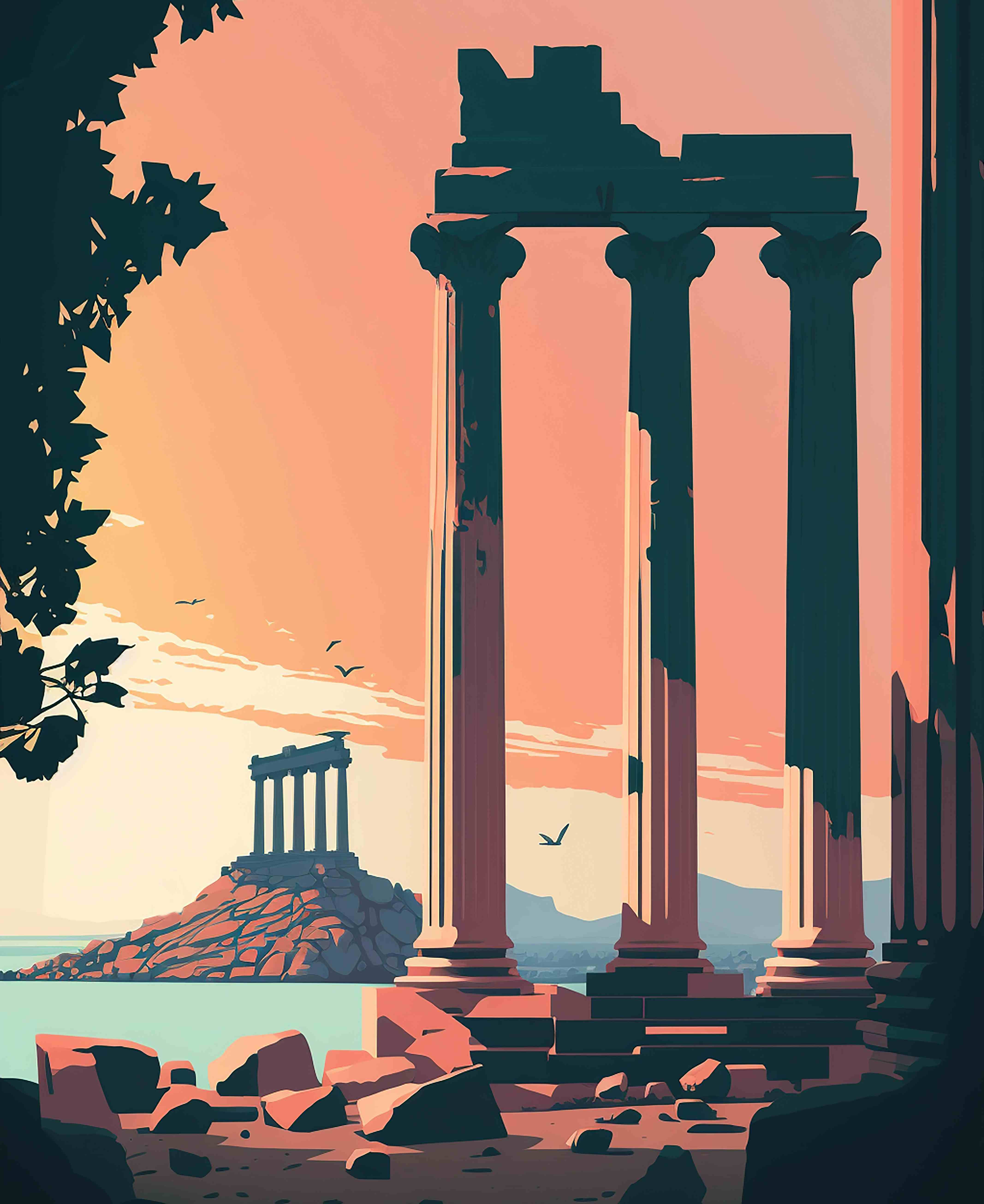 Taking you on a journey to show you the beauty of ancient civilizations around the world. A minimalist style that contrasts sharp architectural structures and the flowing shapes of nature. Artwork created with Ai, Procreate and Photoshop.