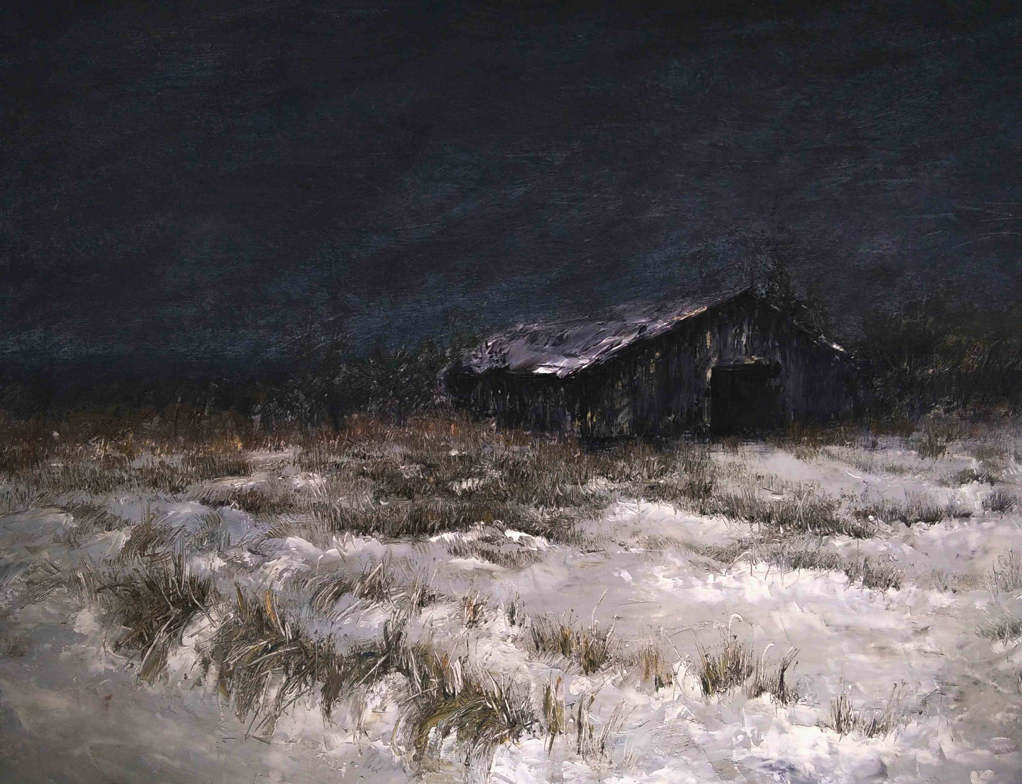 I was looking for a reference for this work for a long time, but in the end I found this farm near our city. There are a lot of such abandoned farms where cows used to be kept in our region. I used to walk on one of these every day when my grandmother worked there. Now they are almost all abandoned, but every time I see them, I feel a strong sense of nostalgia. I wanted to give this place a little mystic, so I depicted it at night. As if we were walking with a lantern and accidentally found it. Physical original materials: Oil/canvas 40x50 cm NFT is sold without the physical original. But the physical original can be sent to a collector upon request.