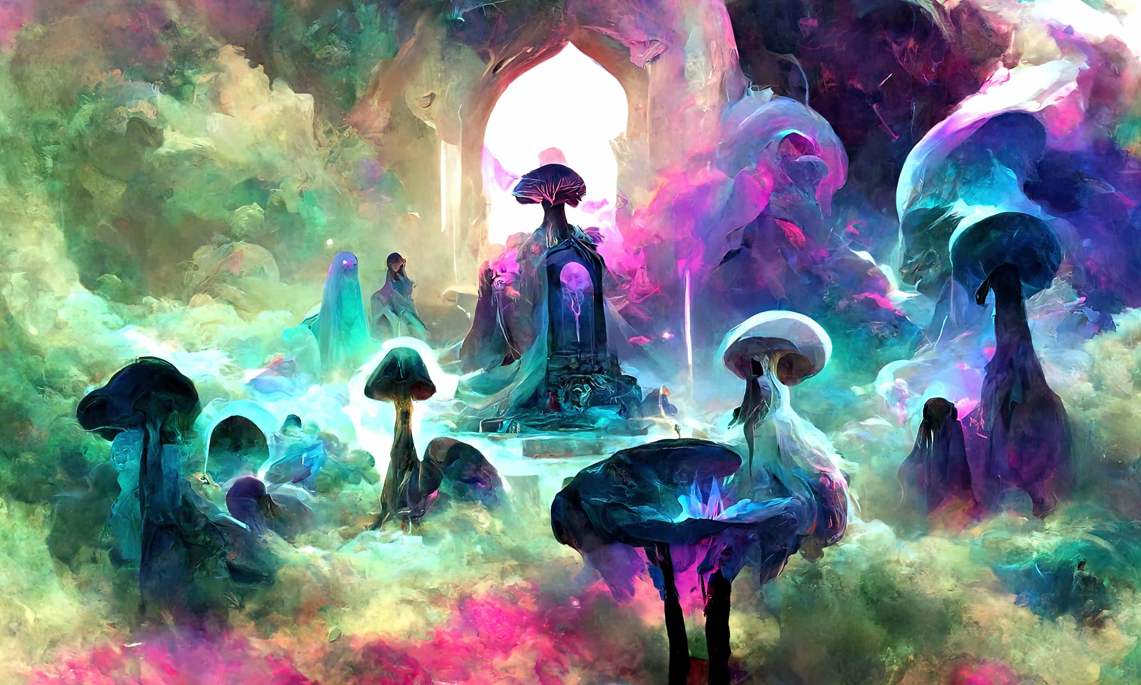 The council of the Mushroom Spirits meet, somewhere in a mycelium dimension, you may join them.