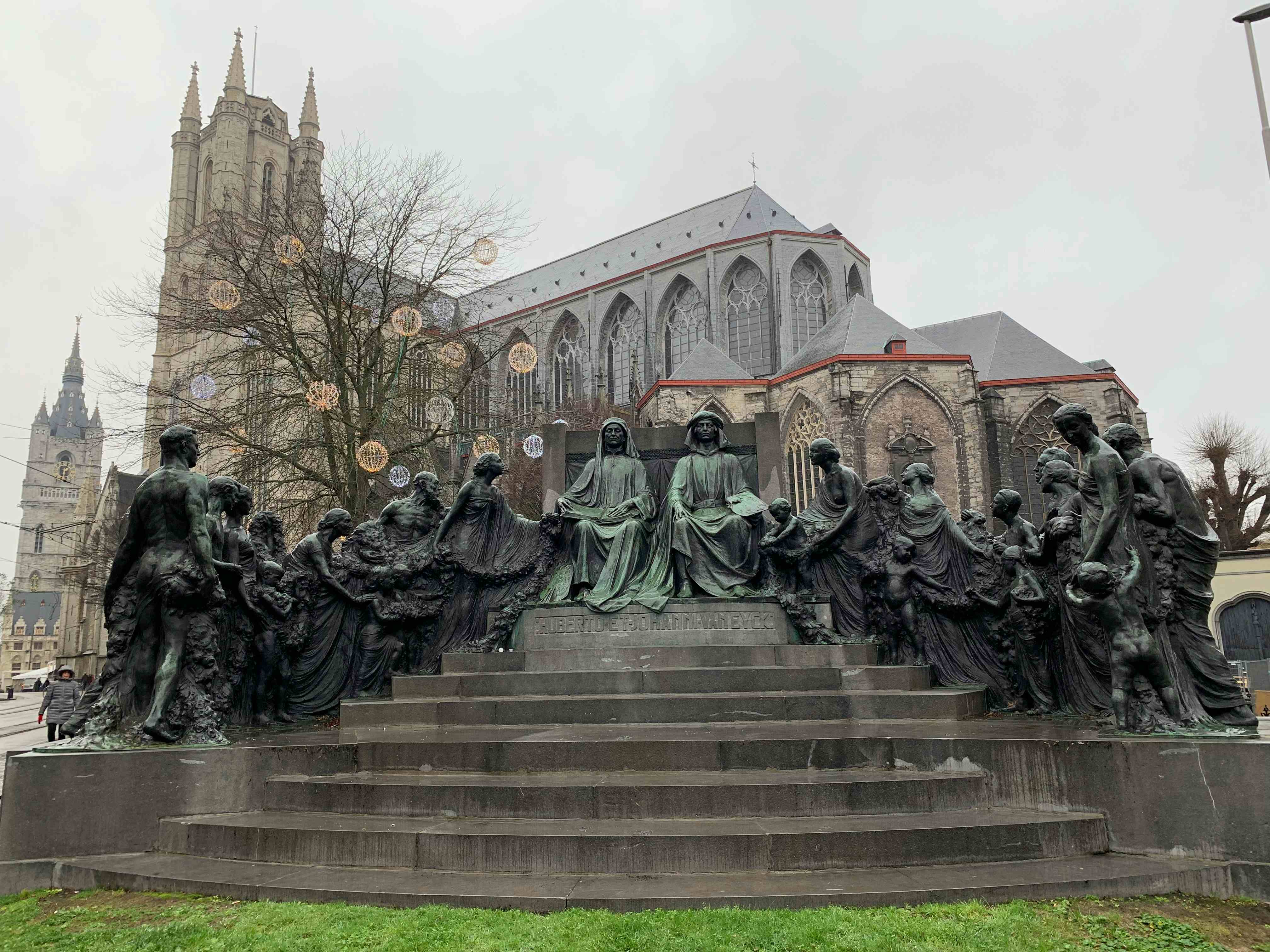 Bronze statue of Van Eyck brothers - Hubert and Jan with St. Bavo`s cathedral on the background, Ghent, Belgium. 2019 4032x3024 5.2MB JPG