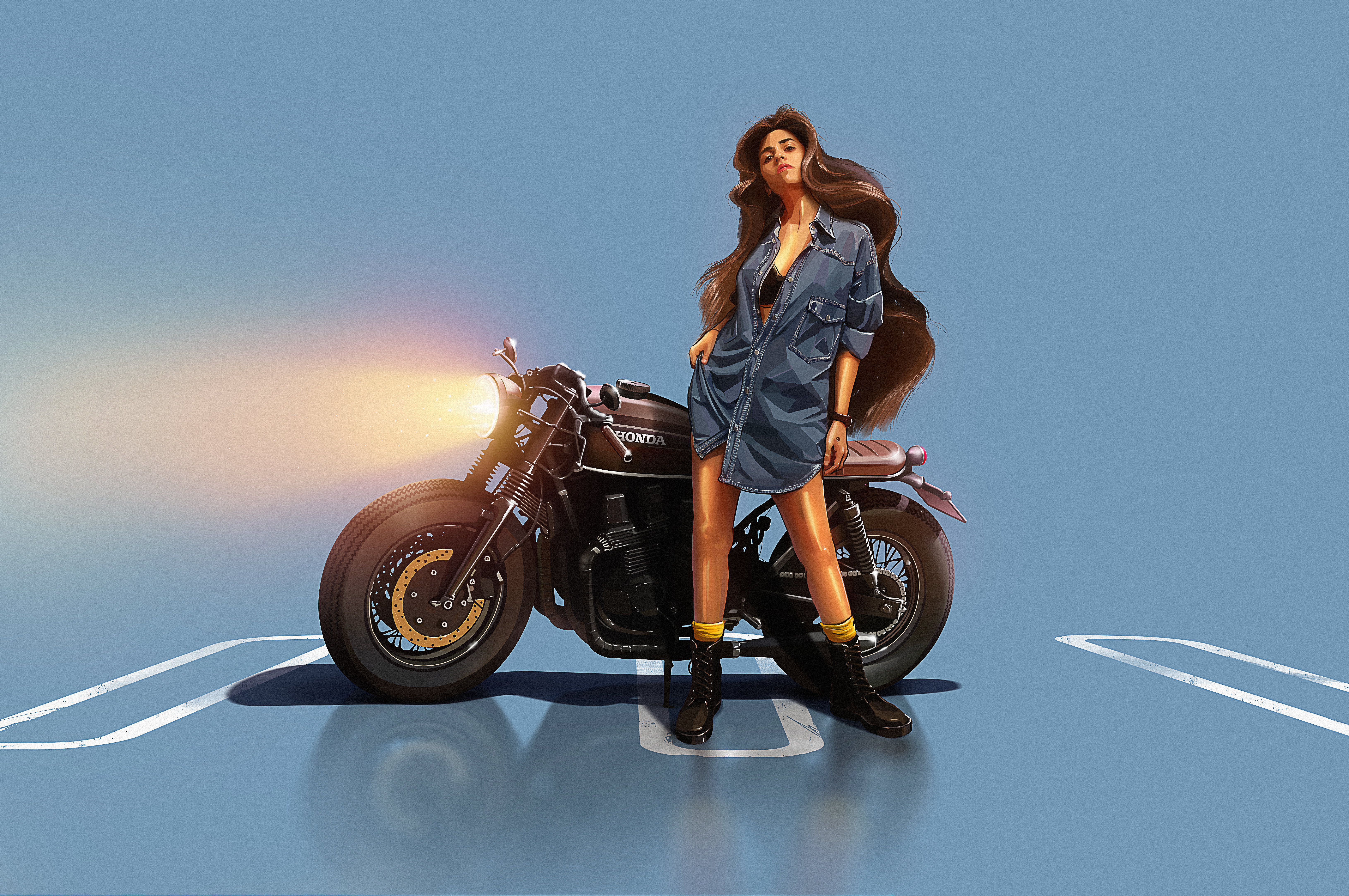 Hannah on her Fury in Cadillac Ranch near Amarillo Texas Station at a time that no one remembers, and all the clocks were stopped! . She always thinks she has a soulmate, Esmeralda riding on her wild horse without saddle or bridle. But she has her bike called fury and riding on from noon to the middle of the night just to wait in Gas Station for the man on the black Mustang. And now she, sure enough, knows that Route 66, the mother road for all bikers is like a forgotten world of cities. And she became a part of the road ... The right moment of a savage girl, that exactly how he liked to see her on the bike, because she could not stop for death! She started from Springfield and he from San Bernadino. They were met in Cadillac Ranch near Amarillo Texas Gas Station, she wants a 5 dollar vanilla milkshake! So they back to Olive Oatmann Restaurant & Saloon in Arizona and then stay that night together in Wigwam Motel Holbrook, .. and against that night everything just starts over ...
