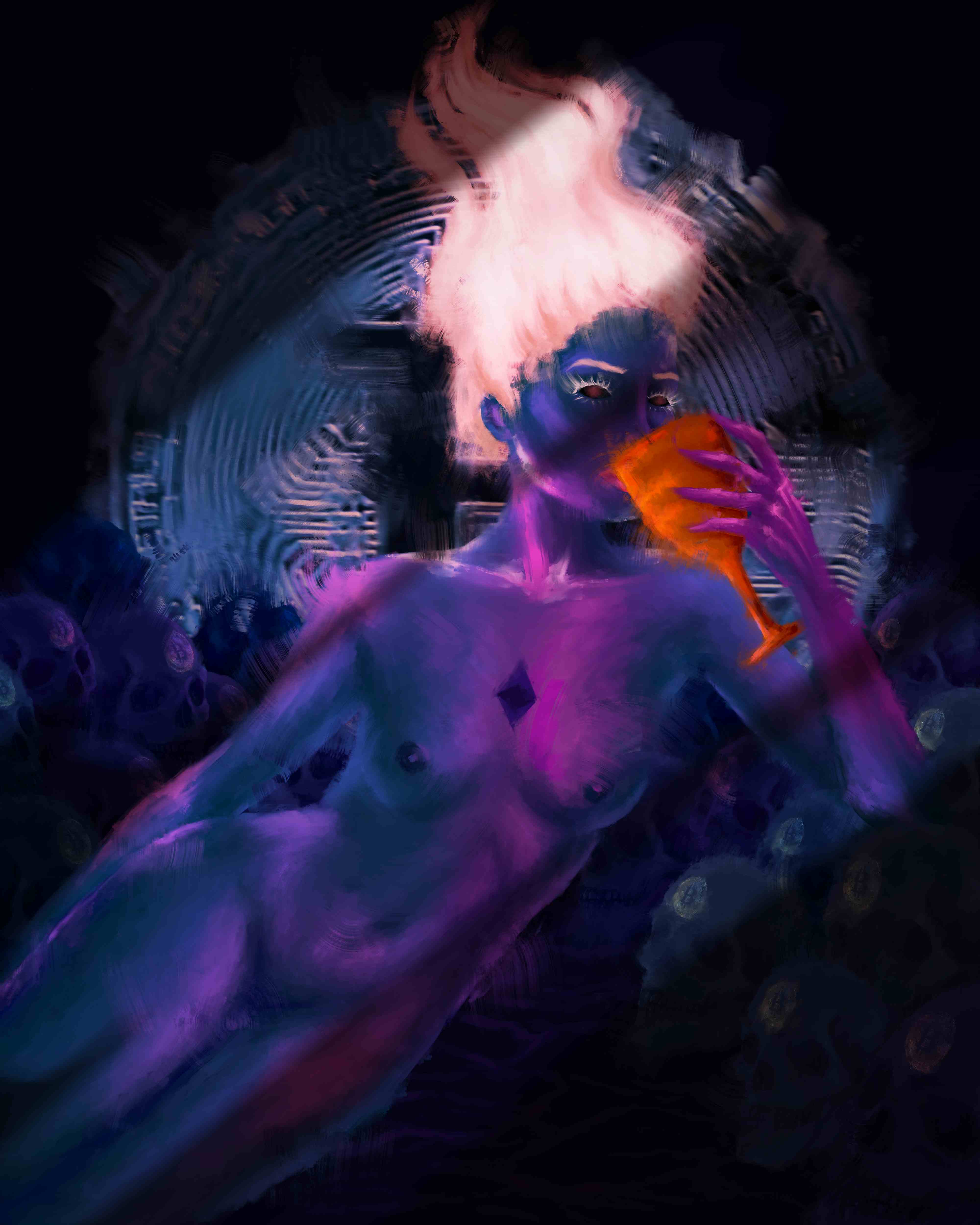 Her majesty is surrounded by the skulls of those ruined by greed. Her hair lights the way to perdition.