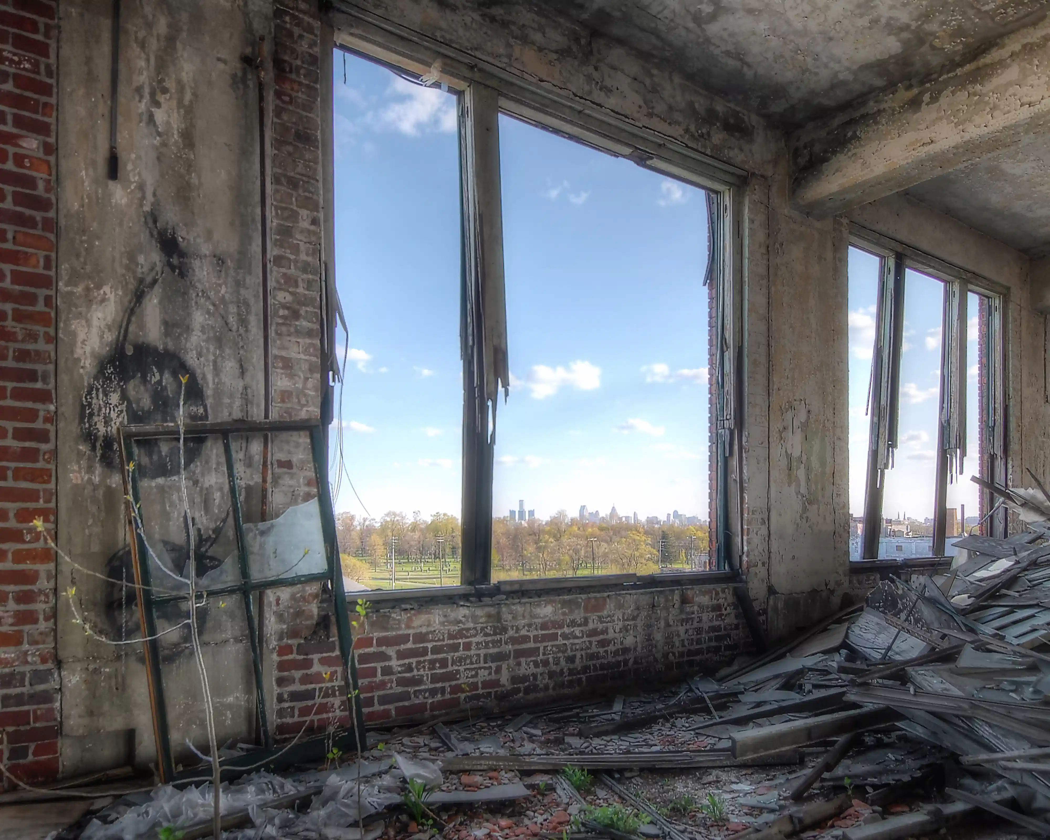 An abandoned building in the former Packard Automotive Plant in Detroit Michigan, USA. On the horizon in the distance, the modern towers of the General Motors Corporation Headquarters are visible, a testimony to the winner in the battle for American luxury car manufacturing dominance. Places and things abandoned are a statement of society’s tendency to move forward, to gravitate towards the new and shiny while leaving much of the old behind. They exhibit an inherent beauty that is mostly overlooked, relics of the past that are left to the elements and time to be reclaimed by nature. The Windows Forgotten collection by Trent North is comprised of 1/1 photos from unique locales around the world. License: The NFT owner has the right to personal use, public display and publication with credit to the creator. Commercial distribution, commercial merchandise and derivative works by permission only. The creator retains copyright.
