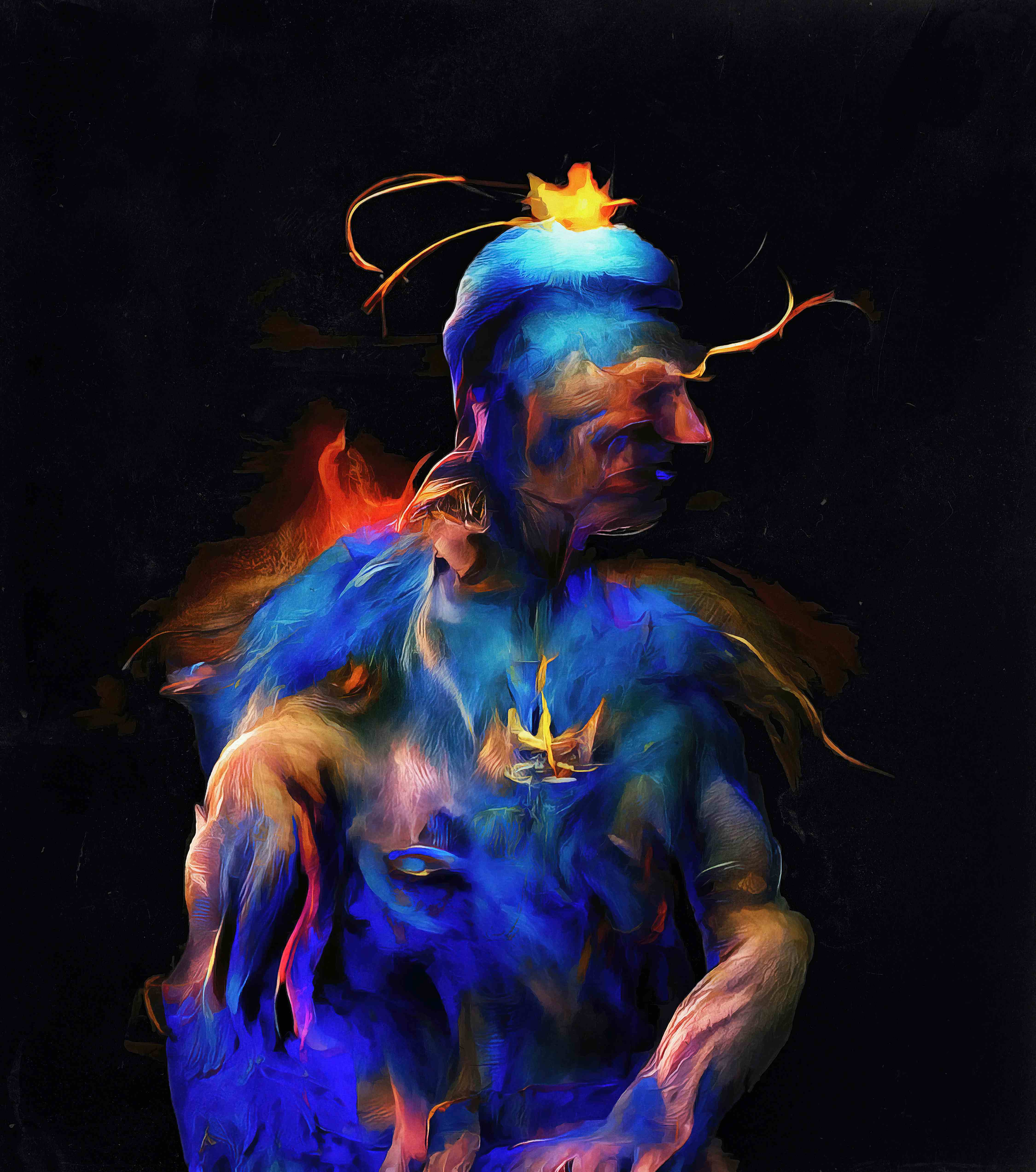 SHAMANIC SESSIONS #01 = 4500 x 5092 pixel jpeg = working with AI has something alchemical and shamanistic in digital contexts a handling of substances, temperatures, feelings, deliberations and a subsequent fine-tuning this series is dedicated to shamanists and alchemists, their experimental ways of working and their becoming and melting into substances the series will be continuously extended with more and more high quality digitally generated works
