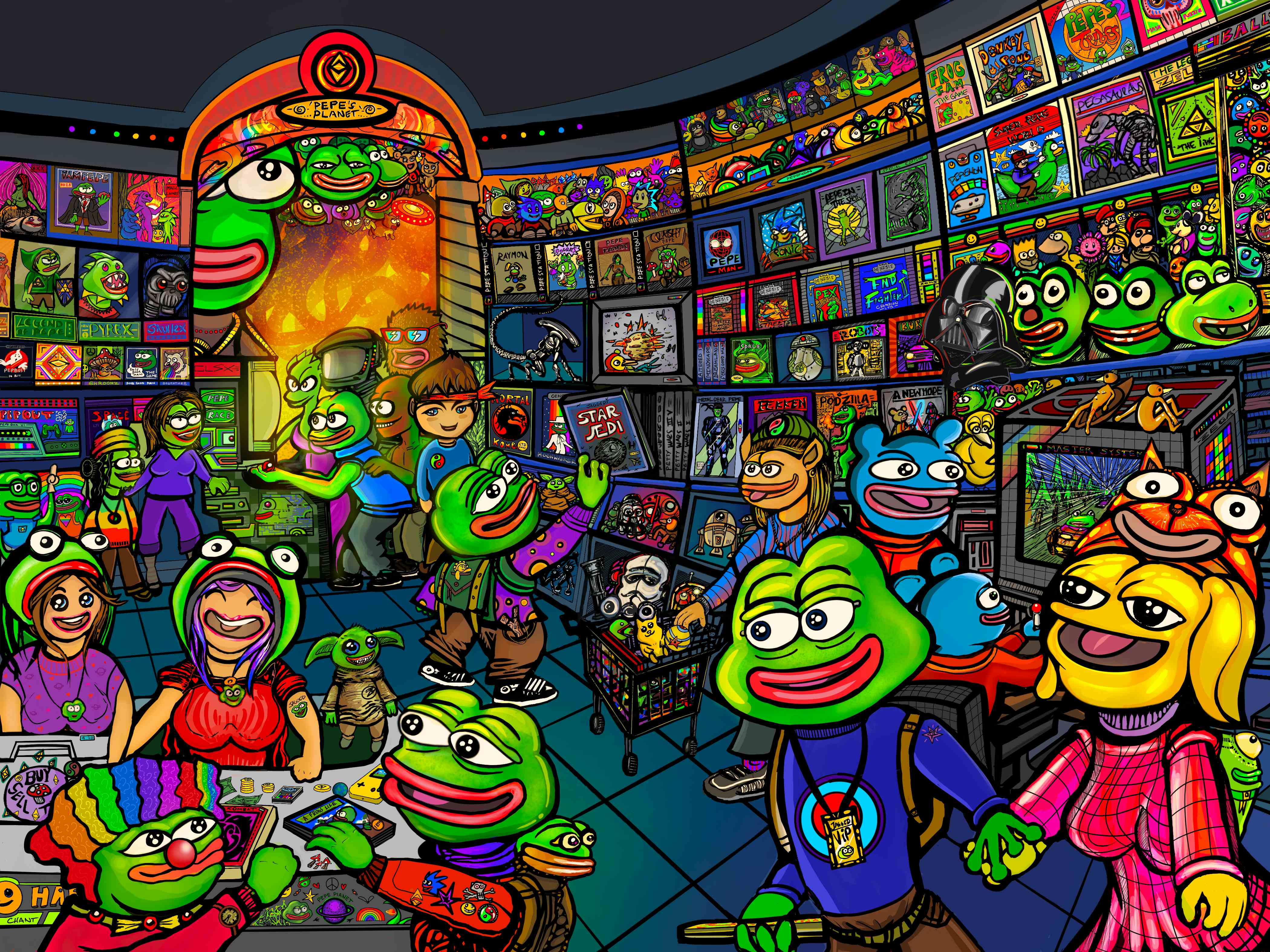 Frogfam friends meet lovingly at the 'Pepe's Planet' game shop to play games and have super fun together. So immersed, they lose track of time completely! 4200 X 3138 600 DPI Credits: Boy's Club Characters design by Matt Furie © All Star Wars Characters design by Lucasfilm © @ndhaus - Zeus Pepe © Modified game ideas © - Mario, Sonic, Spiderman, Tomb Raider, Crash Bandicoot, Rayman, Ghost in the Shell, Godzilla, Wipout, Street Fighter 2, Gex, Streets of Rage, Shadow of the Beast, Legend of Zelda, Donkey Kong, Lemmings 2 - Tribes, The Legend of Zelda, Robots, Tekken, Moonwalker, Burnout, Pacman, Pokemon, Mortal Kombat, Aliens, Ghostbusters. Original artwork by Chant 29/02/2022- 13/03/2022 Time spent drawing on Ipad: 80 Hours and 17 Mins Total strokes made: 109884