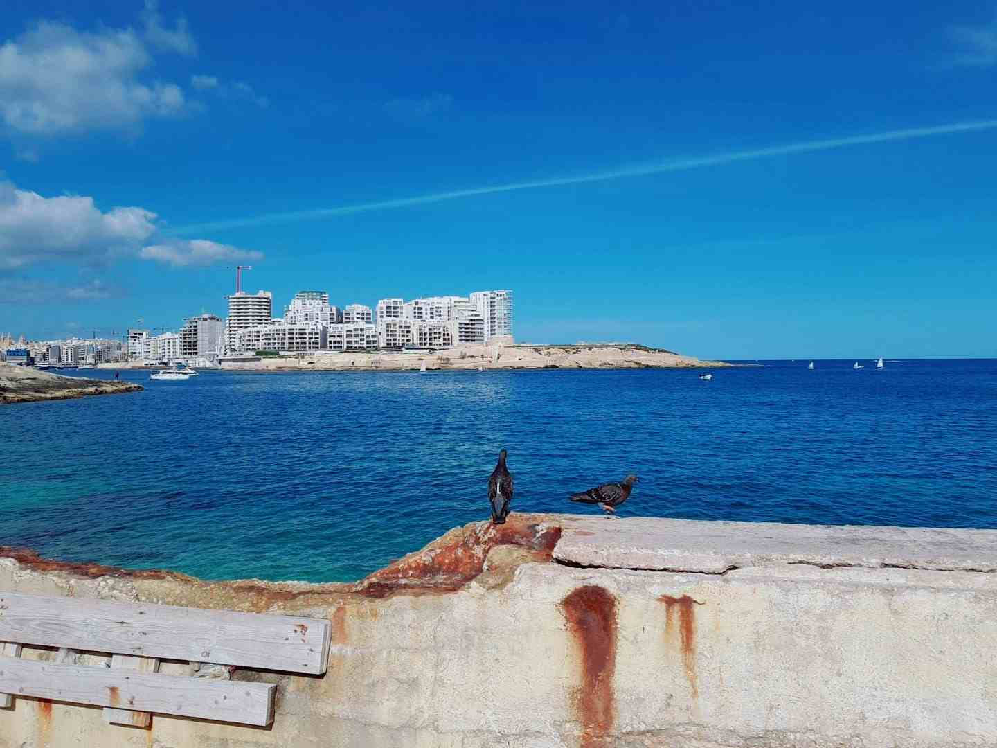 Blue sky and blue sea and blue waves. There is a town across the sea and the birds are looking at it. It's pretty far away for us. But for these birds, it's probably closer. The birds can reach that place with a brief flap of wings. They are resting for a while for making a new leap forward. I stopped to take in the view and captured this moment. Now we're all looking at this blue scenery.