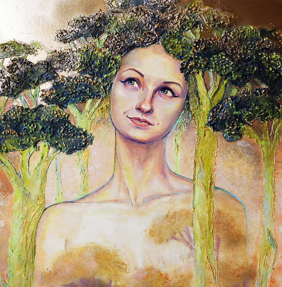 Self-portrait. NFT "Thoughts of Broccoli" is about obsessions in the mind. When the creator has an idea, he can't think about anything else but its realization, like as drawing broccoli like in this artwork. Canvase, plaster, acrylic. 1000x1000 px