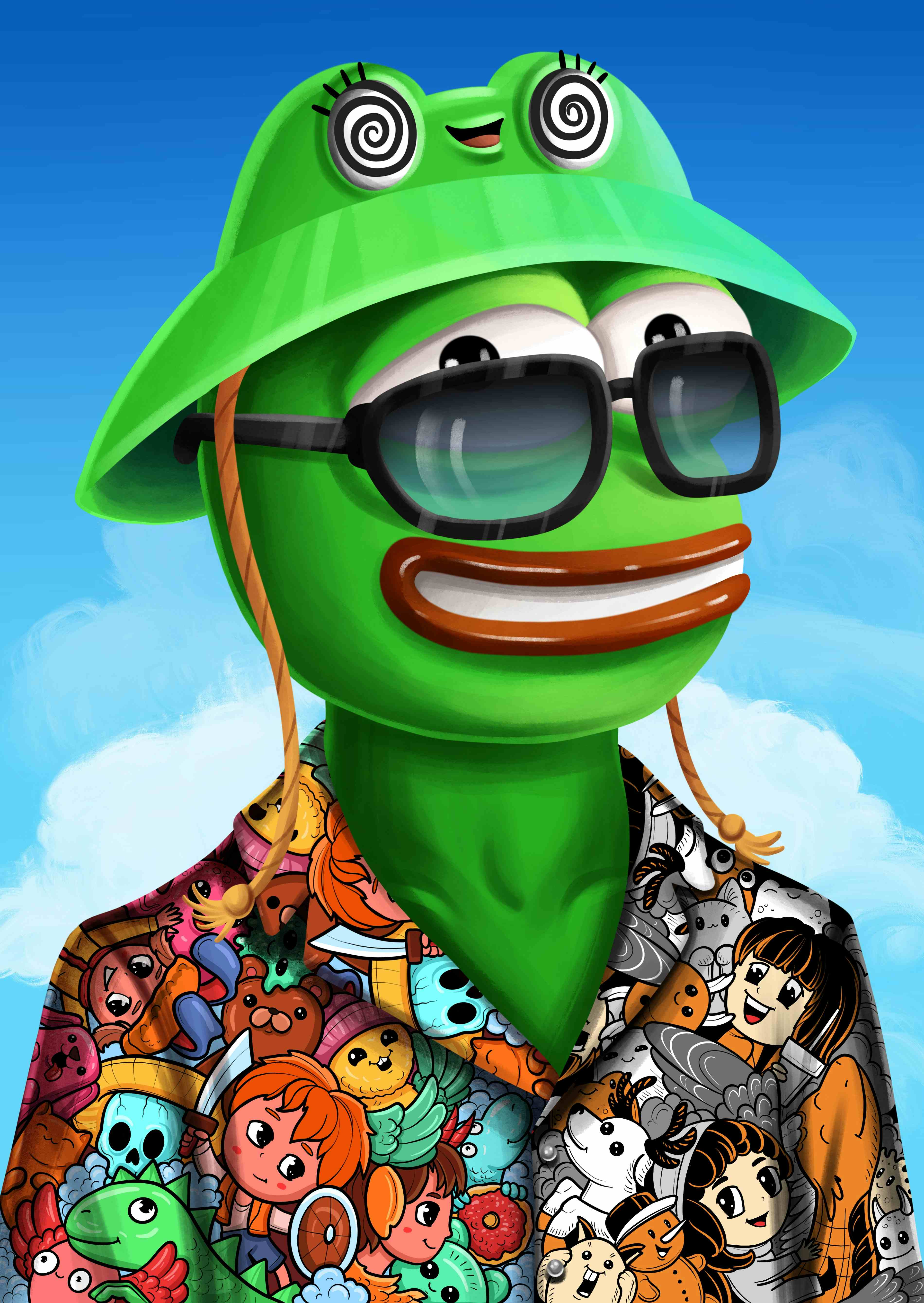 I imagine this frog as a cool, interesting and funny person who wears colorful shirt and rests on the islands. I'm inspired with Pepe. I'm so happy that I feel a lot of positive thoughts because of this character. Technique: Procreate Size: 3800x5356, 600dpi RGB