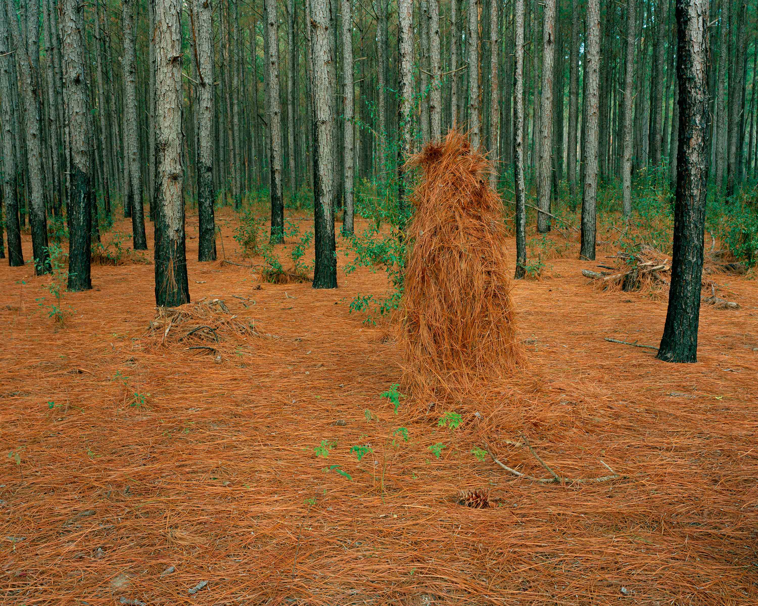 Ghillie Suit (Pine Straw), 2010 Photograph by Jeremy Chandler Image size 1600 x 1280 pixels The Ghillie Suits are a series of constructed photographs by Jeremy Chandler. Figures are pictured embedded in a variety of terrain camouflaged by handmade camouflage garments. The images reference a spiritual and visceral connection to landscape. Jeremy Chandler’s art practice continues to grow out of a desire to express his personal history, experiences and relationships through a process that emphasizes structured improvisation with the places and people he photographs.