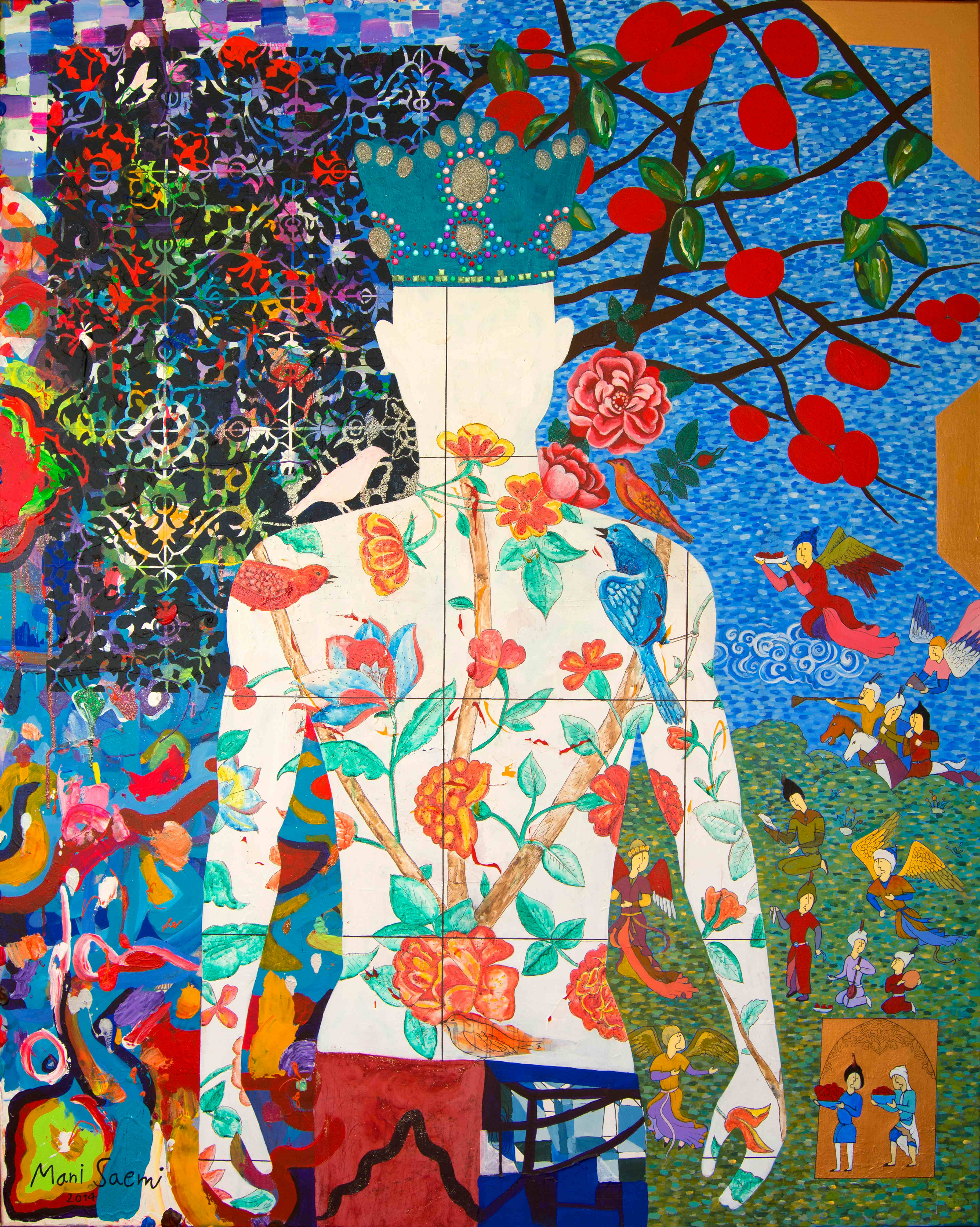 In this piece I wanted to convey the feeling of being in a world without borders. This painting took me about six months to complete with many layers, due to its intricacy and detail particularly inspired by Persian storytelling and the traditional patterns found in carpets and tiles. The word “Today” is incorporated into the painting and became its title. Today in my adopted homeland in the West, I create my own stories, colorscapes, shapes, and textures. Exhibited this piece in multiple international exhibitions and galleries in Sweden and also displayed Today at Museum of Dos Terceiros, Portugal. Material: Mixed Media One of a kind Artwork by Mani Saemi Size:47.2 W x 59.1 H inches