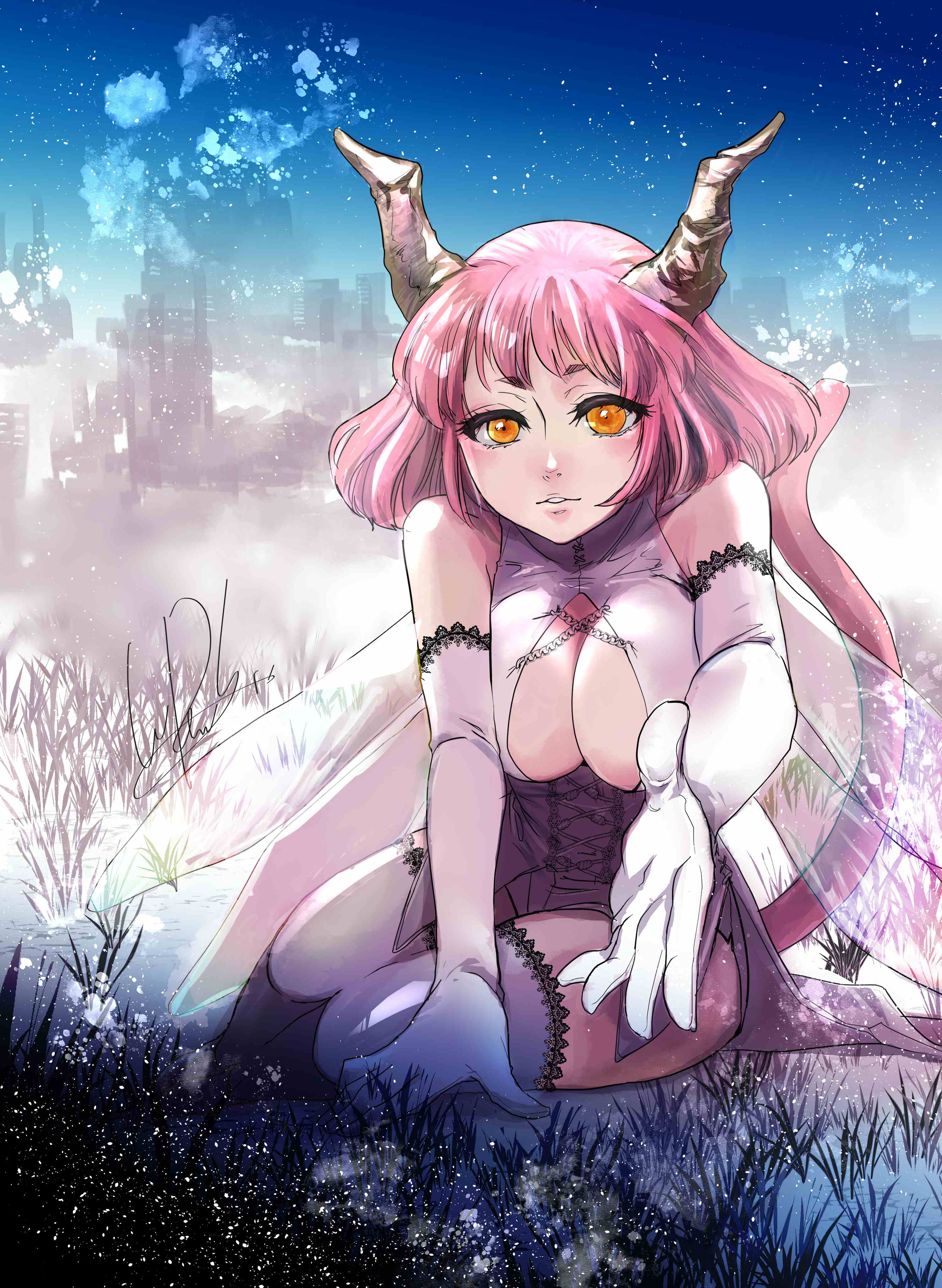 You are hiding behind the grass. This is a dense place. You are anxious and wondering what to do, when a mysterious girl with horns and wings appears. She is MANGETSU, an immortal girl who loves everything. She found you anxious and asked you to come to her. Let's go together," she said. The hand extended to her is full of kindness. 草陰に隠れた貴方。ここは鬱蒼とした場所。不安に苛まれ、どうするべきか迷っていると、そこに角と羽の生えた謎の少女が現れた。 彼女は満月。不死である彼女にとって、何もかもが愛おしい。 不安そうな貴方を見つけた彼女は、 「一緒に行こう」と声をかけた。 差し伸べられた手は優しさに満ちている。