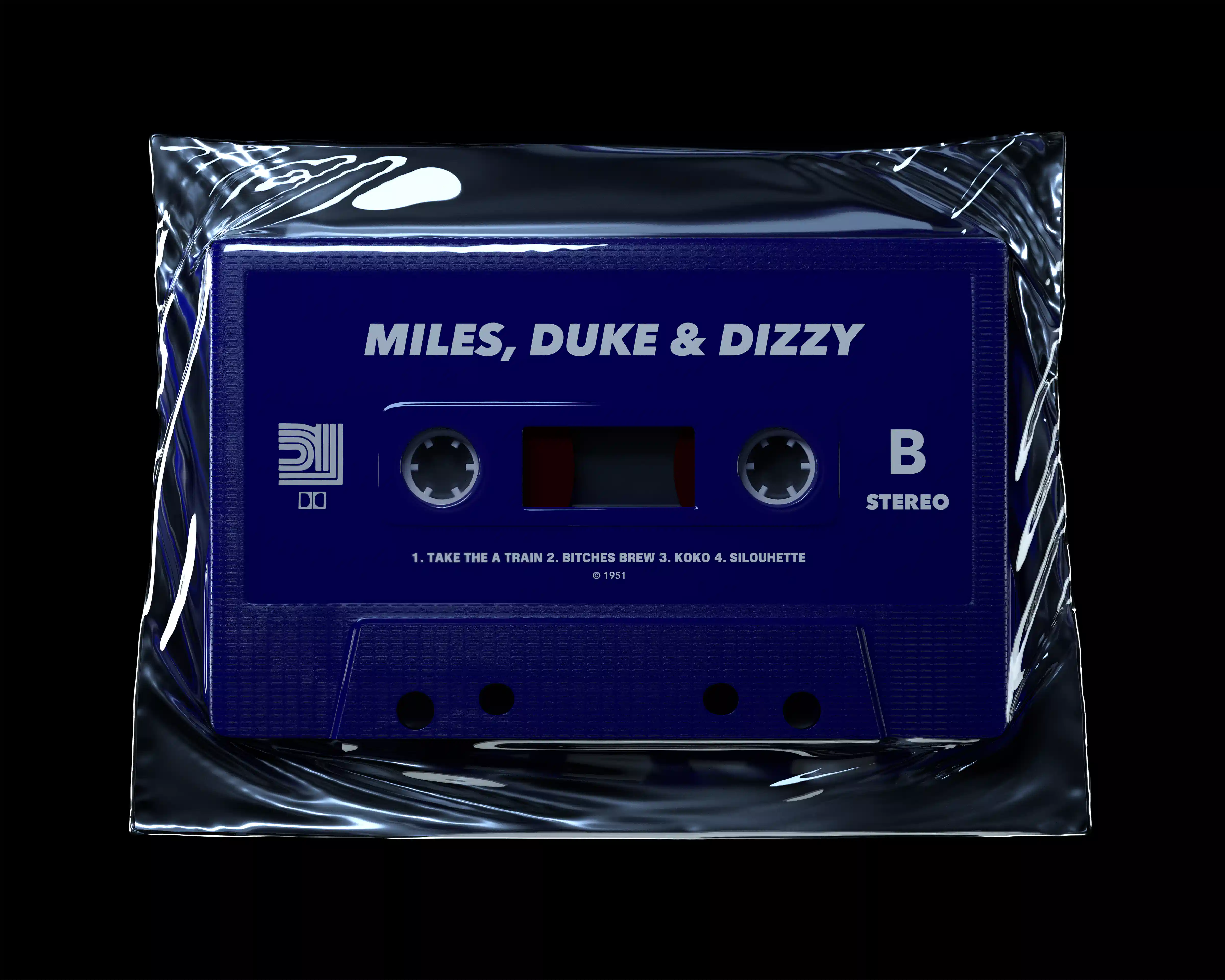 The Miles, Duke & Dizzy cassette under shrink wrap. Three legends of Jazz on the same album, playing classics. A collaboration dreamed by many that will only exist visually. Following my successful photography series of rare and legendary albums on tape, I wanted to create a collection of cassettes that gathered iconic artists. The hypothetical collaborations unfortunately never happened, however each piece invites the viewer to personally explore how name association informs their own interpretations and projections of what the music could have been. The shrink wrap connotes the rarity and collectability of the object itself while reflecting on the preciousness of such collaborations.