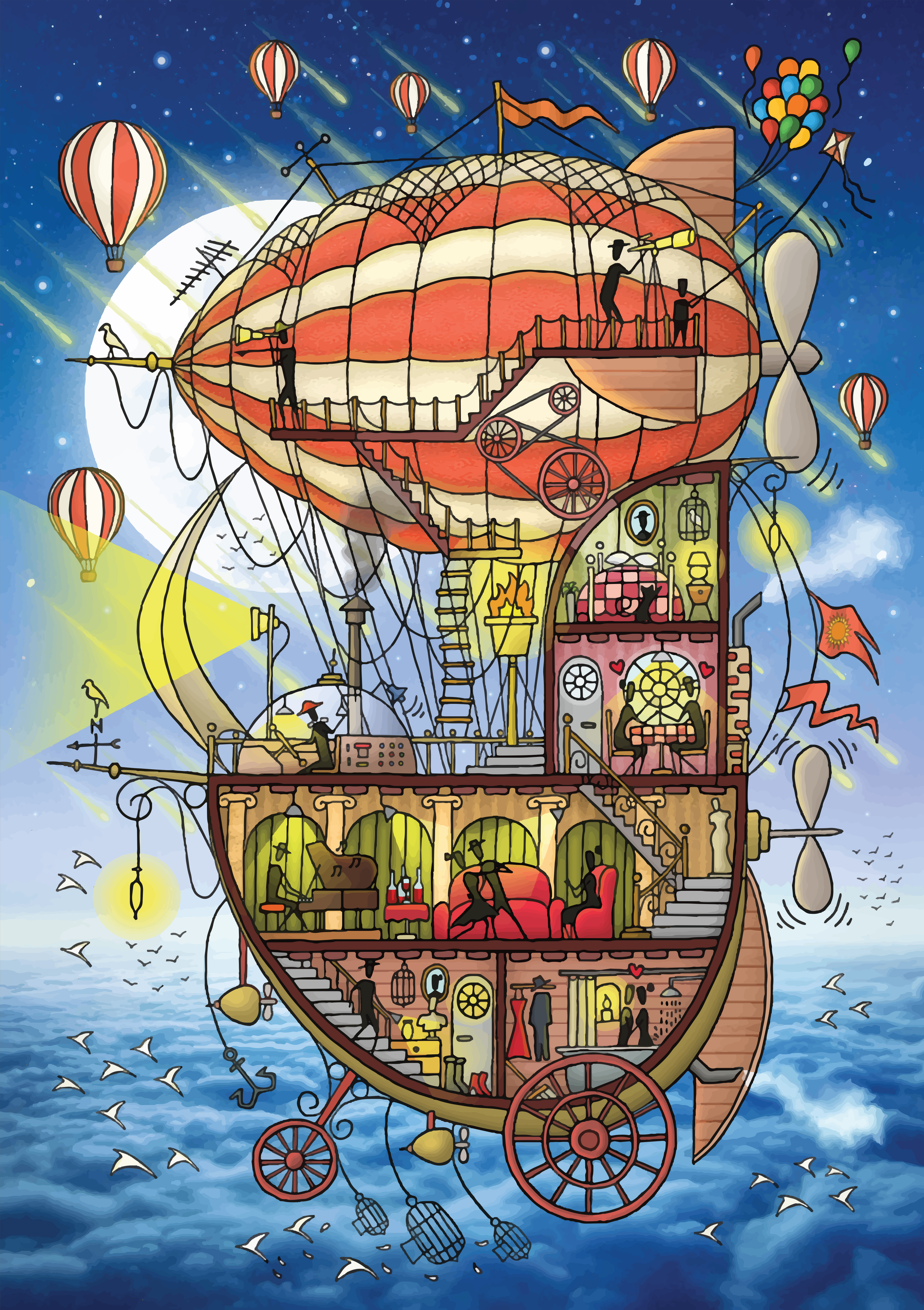 Somewhere in Neverland, above the clouds, a family was living in a house that was flying toward the moon on a dreamy journey. A long time ago, This family had left their homeland because they could not fulfill their dreams there. So, they decided to build their own flying house and set off on a journey to the moon where all dreams come true. They flew millions of miles away from their homeland, and there were still millions of miles left from this trip. They did not know whether they could finally achieve their dream to set foot on the moon or not! But who knows, maybe they had already achieved their true dream. The Dream of Freedom…! Edition 1/1 3500 * 4960 px Hand-drawn on paper, edited in Adobe Photoshop and Adobe Illustrator