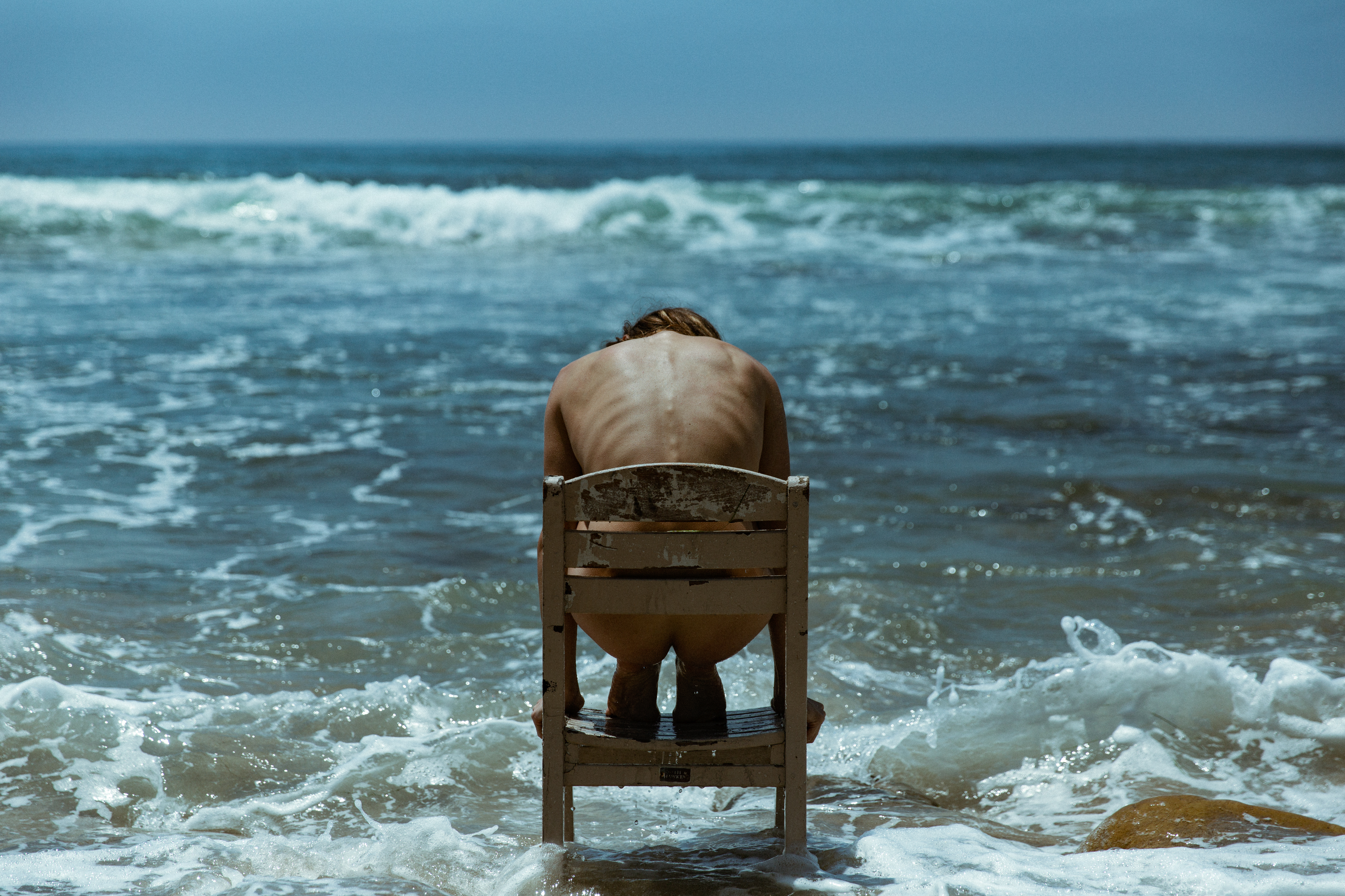 An oceanic photo featuring Chelsey Sinclair and a chair we brought to the Pacific Ocean.