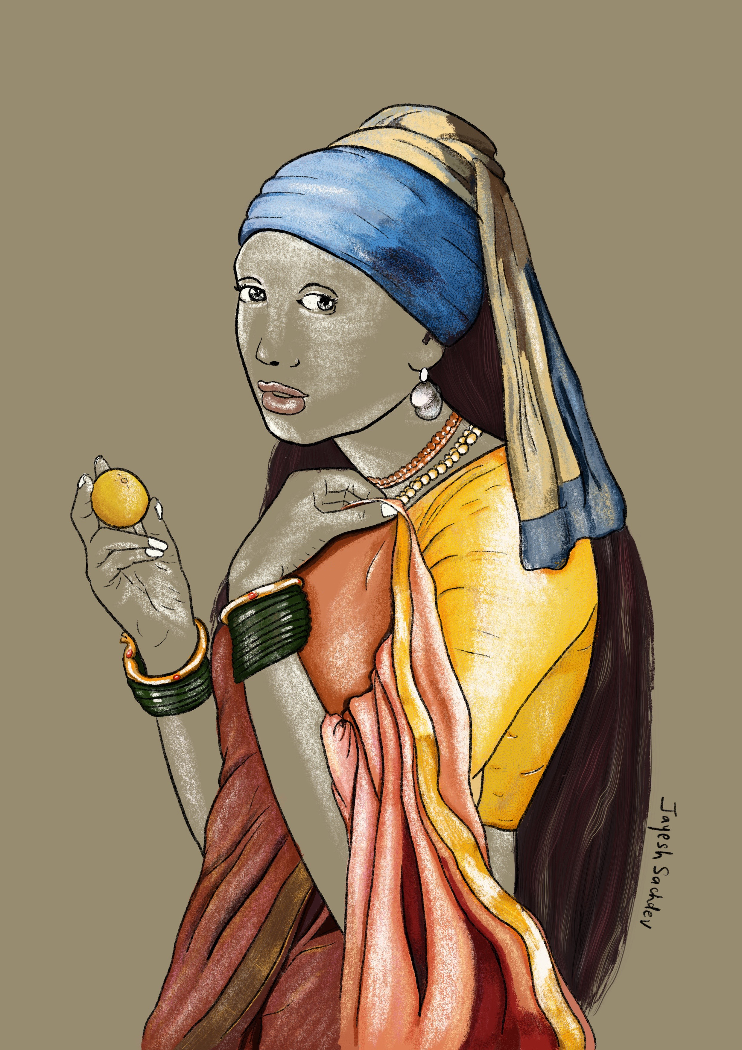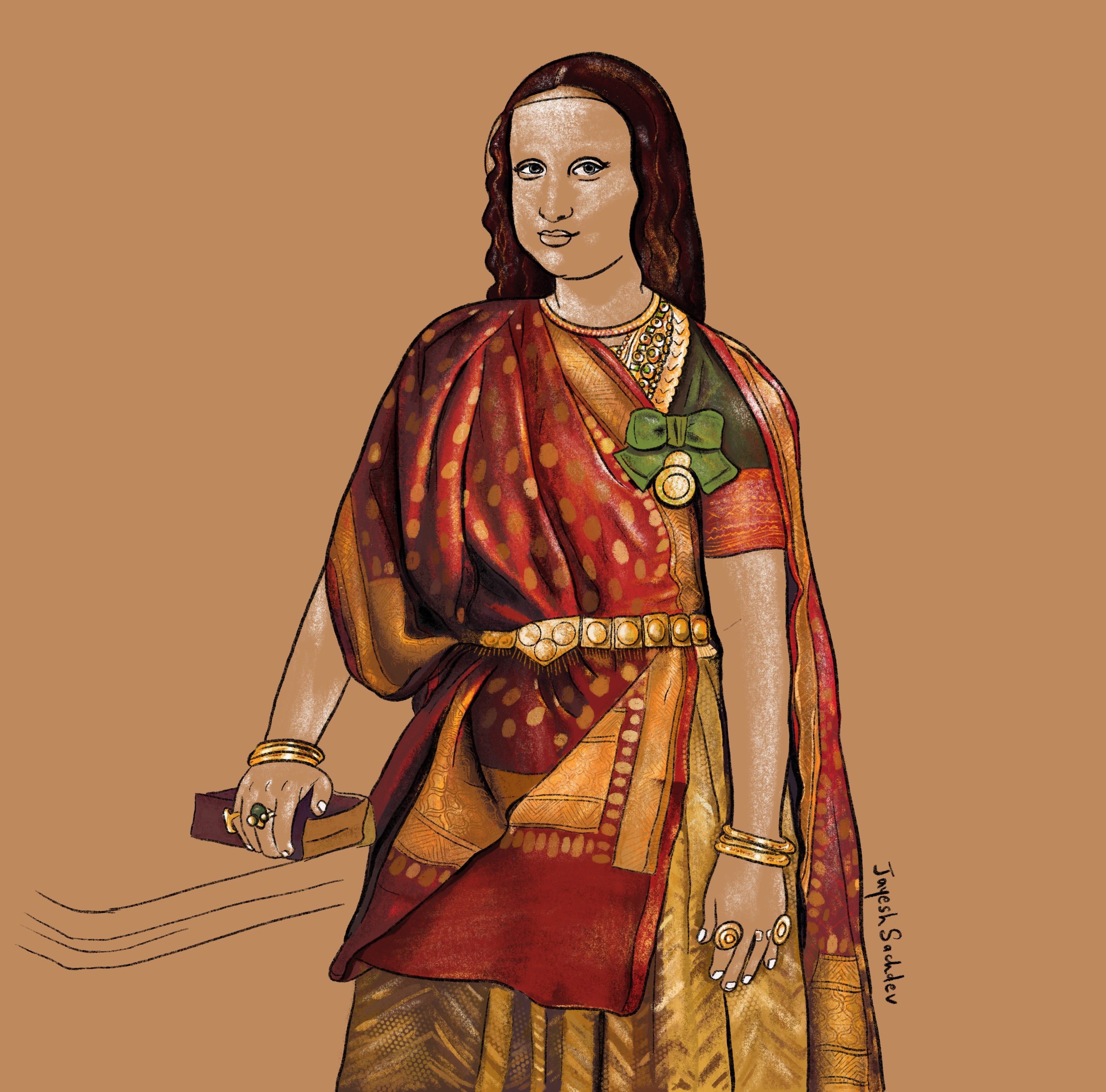 A digital painting of Mona Lisa as Indian Royalty.