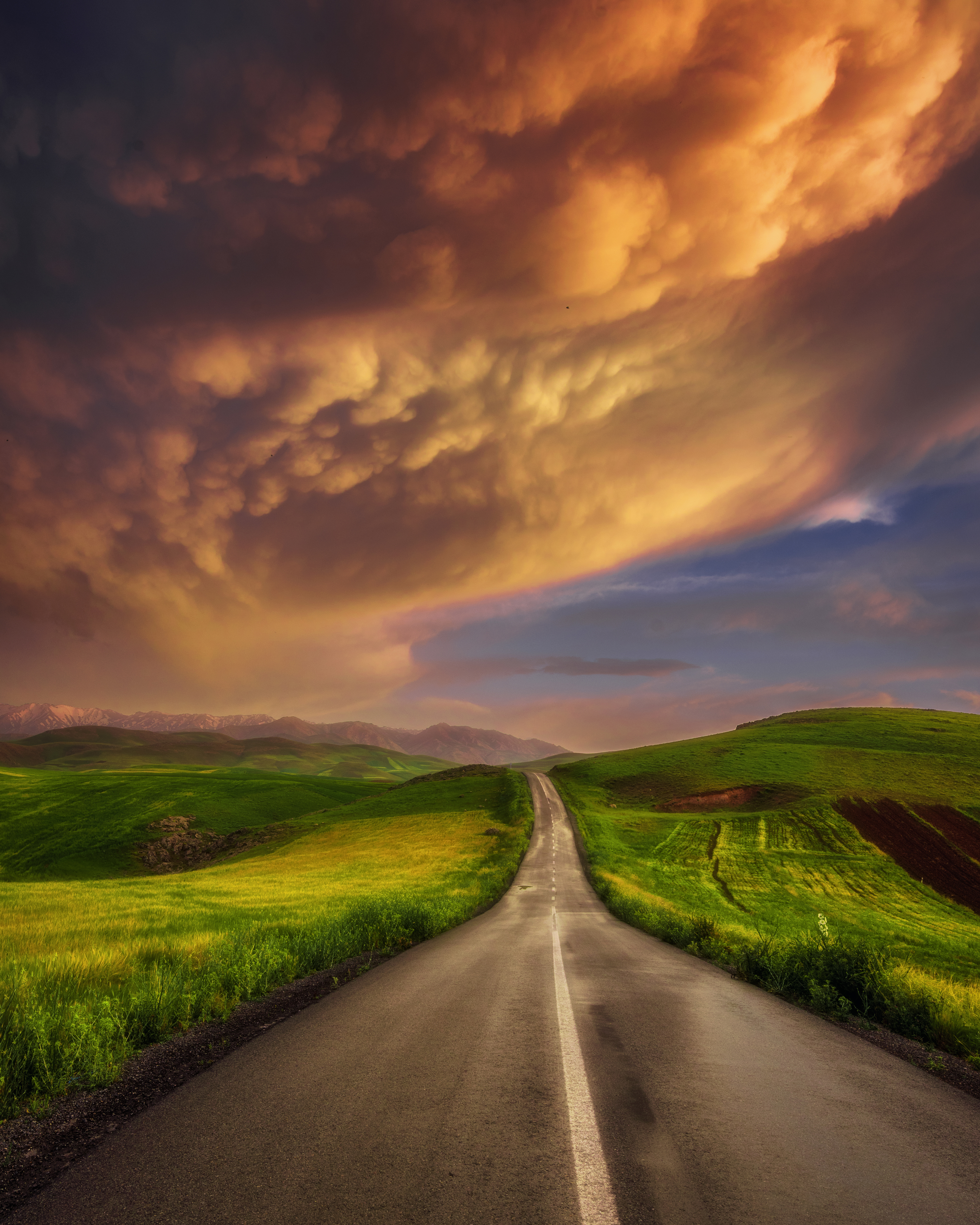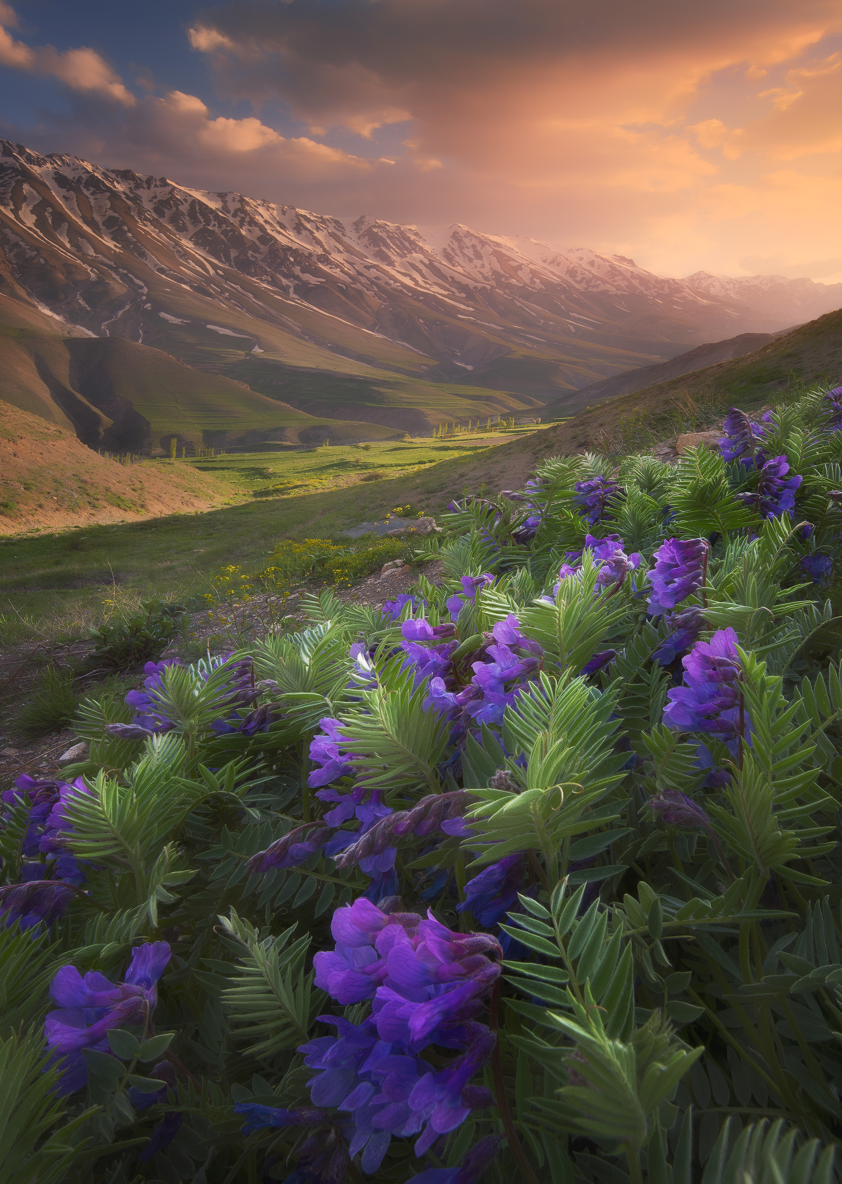 I traveled to this beautiful place last spring. Beautiful purple flowers enchanted in nature. There was beautiful snow on the mountains. The sunset had cre