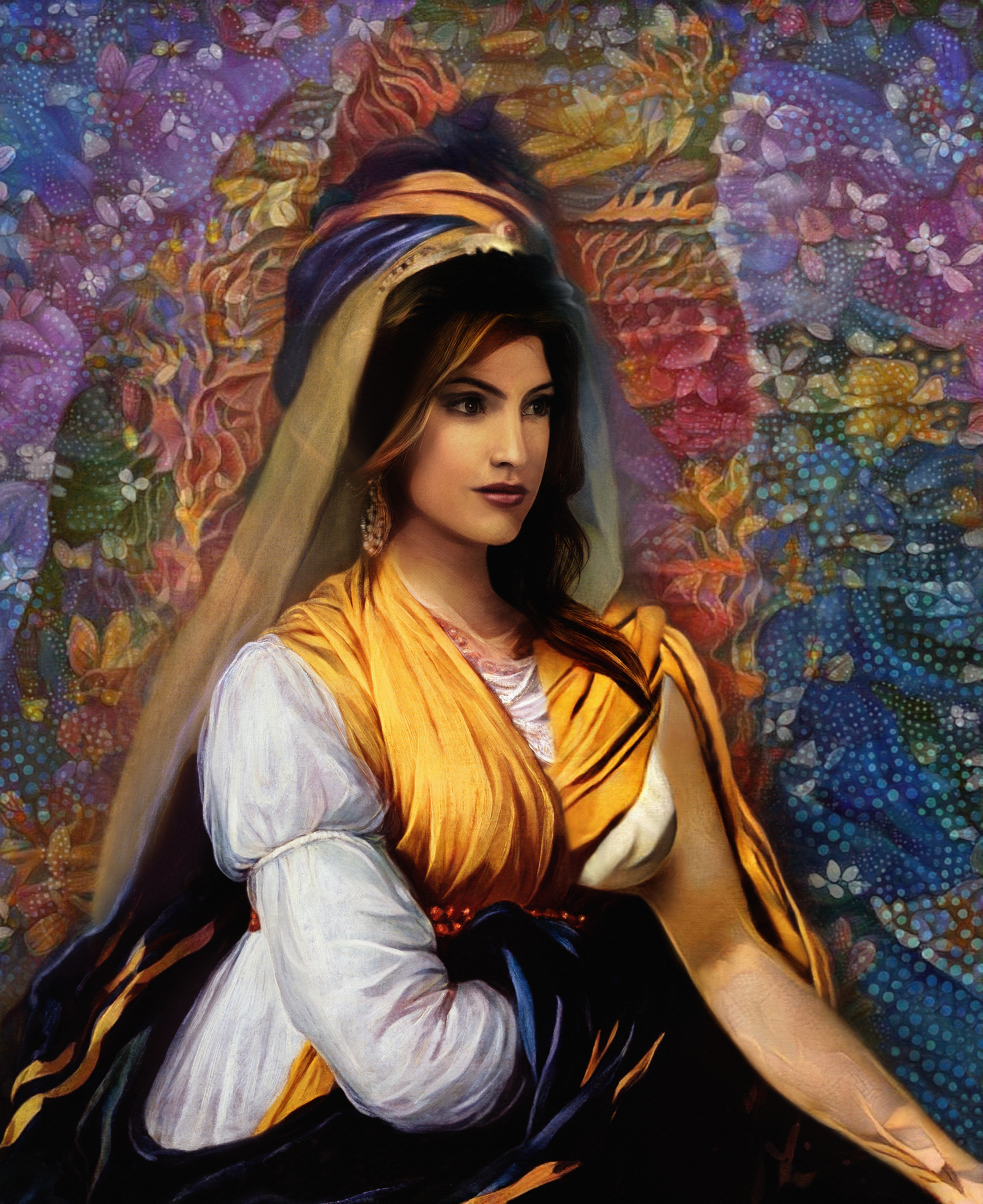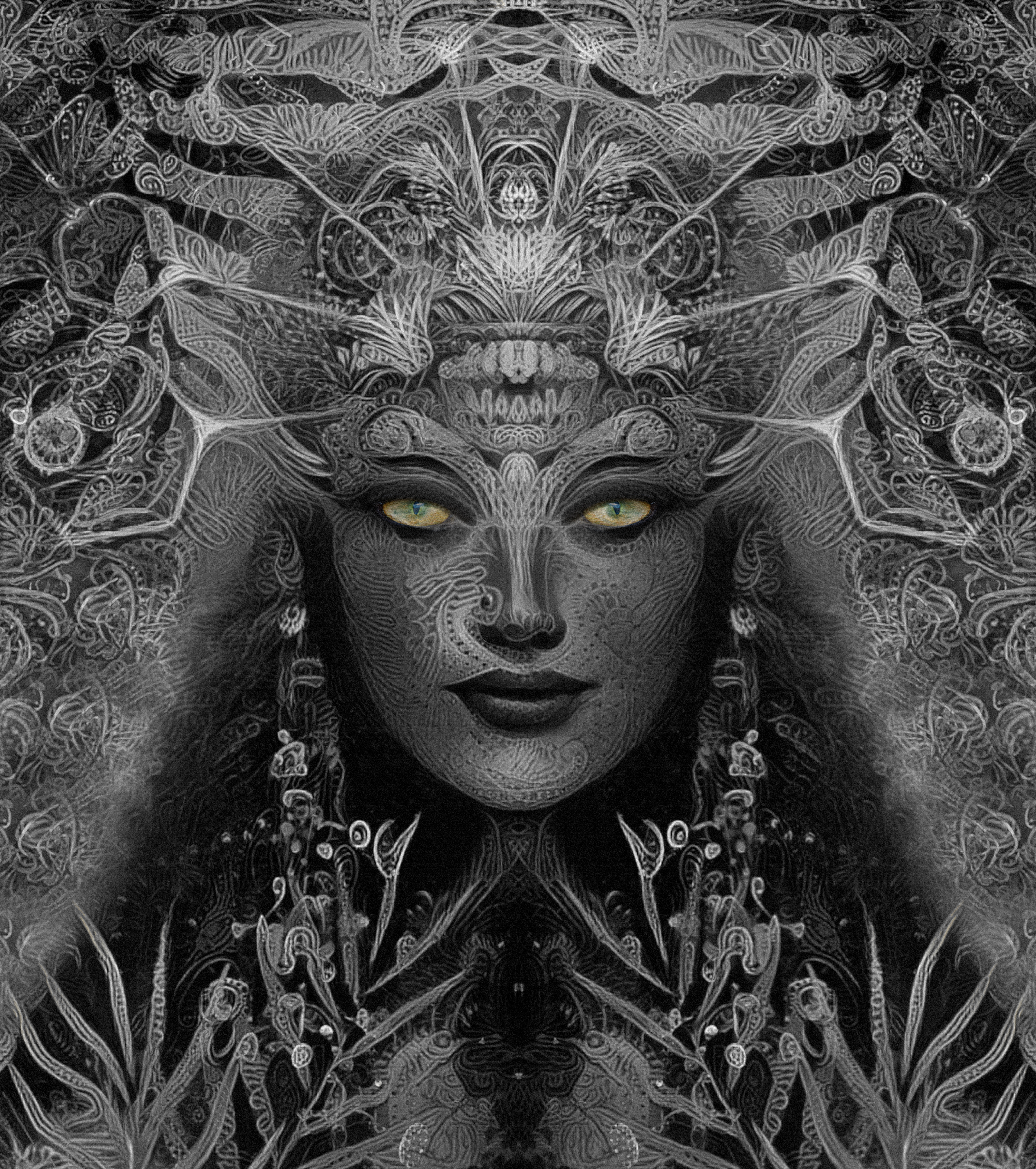 This work delves into envisioning the face of Goddess Kali. It was a wonderful challenge to create her eyes. I endeavoured to find a pair of eyes that pull