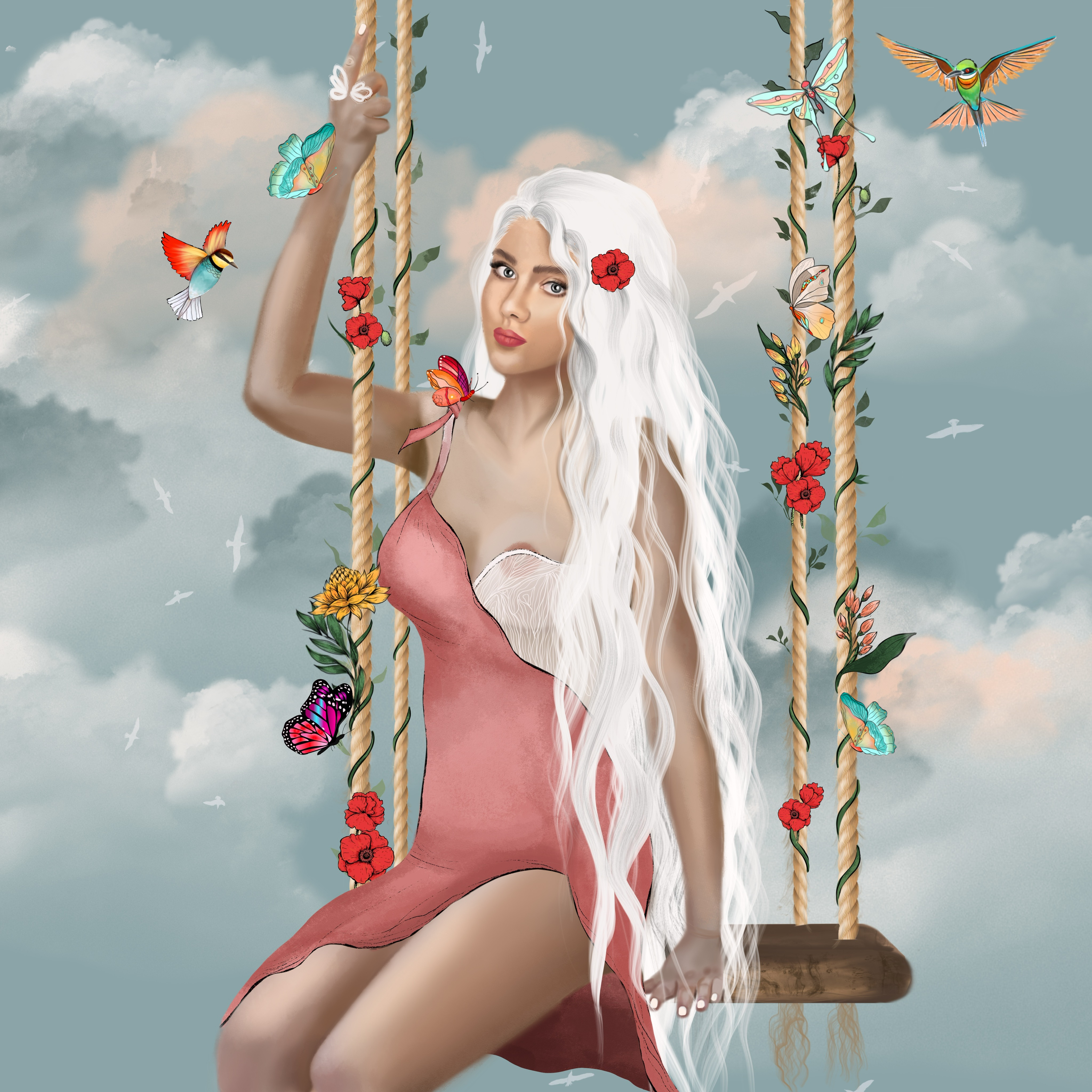 My first day in paradise I wondered what it would bring, Hidden in the skies amongst the clouds I saw swing, A maiden singing her beauty matched her tone,