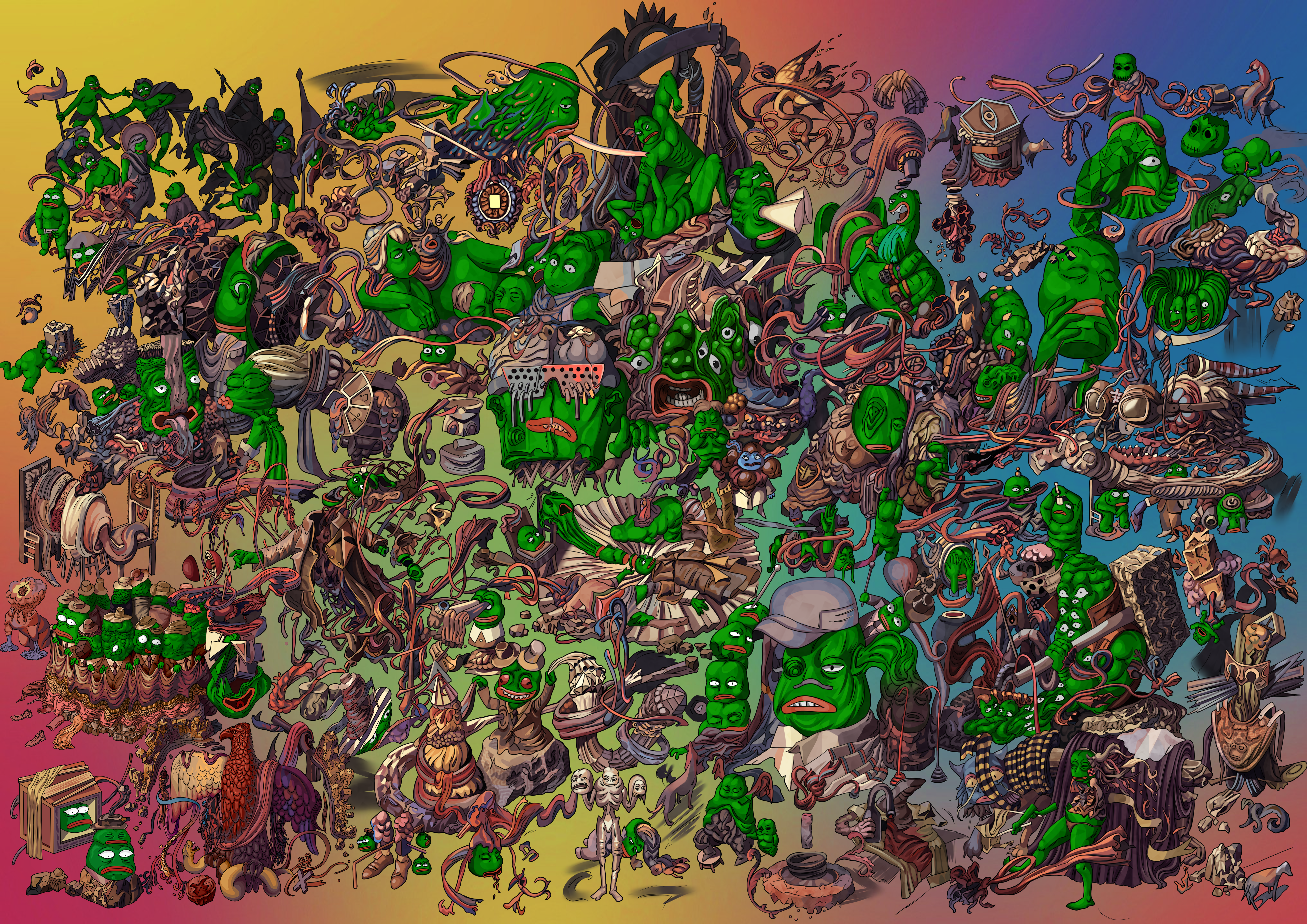 Composition inspired: ''Pathfinder - Monster Codex'' by Wayne Reynolds https://www.waynereynolds.com/ Characters inspired: Pepe and PegzDAO by © Matt F
