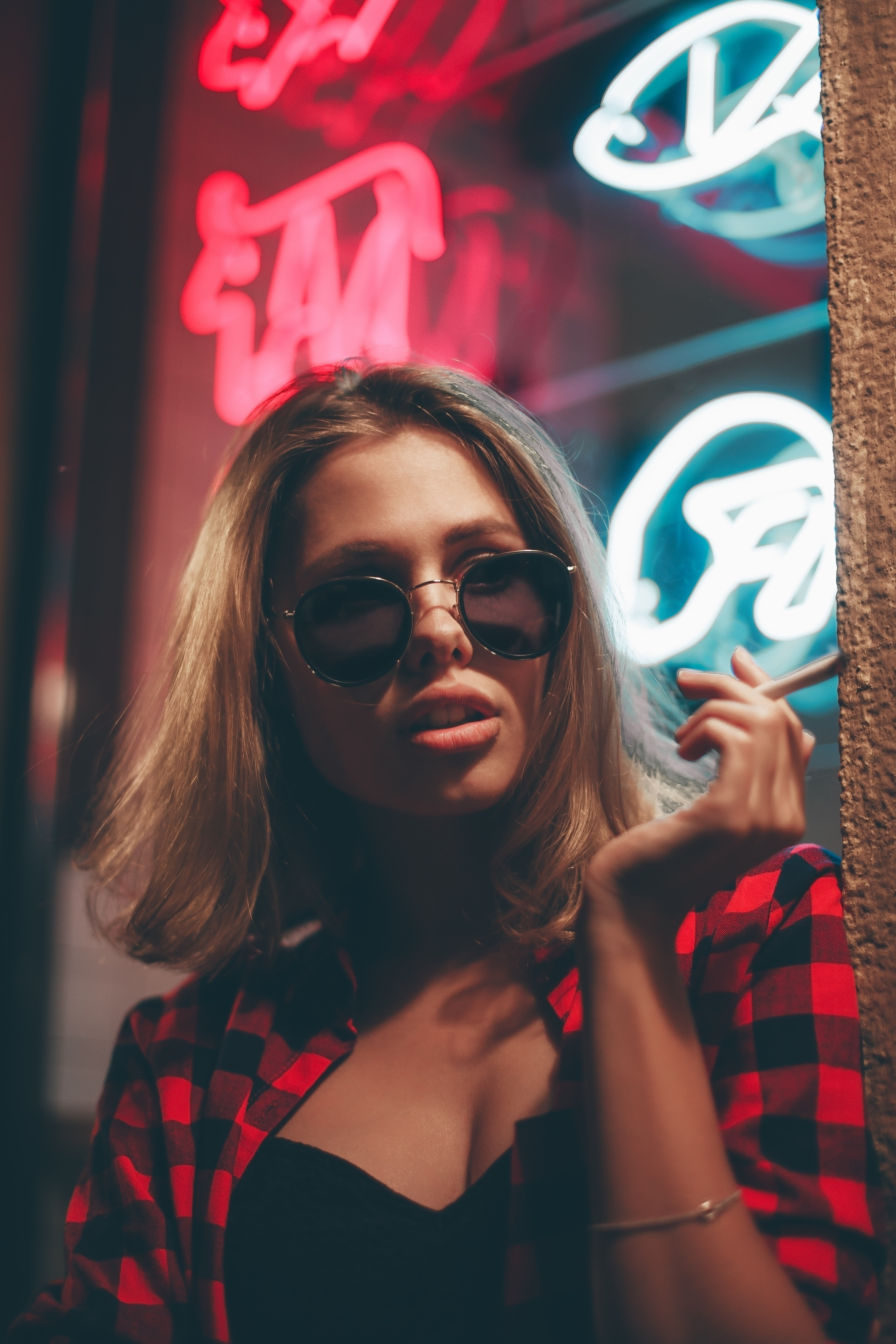 'After Dark' A woman reaching for a box, photographed through a fogged up window pane. The colors of her clothes harmonizing with the reflections on the g