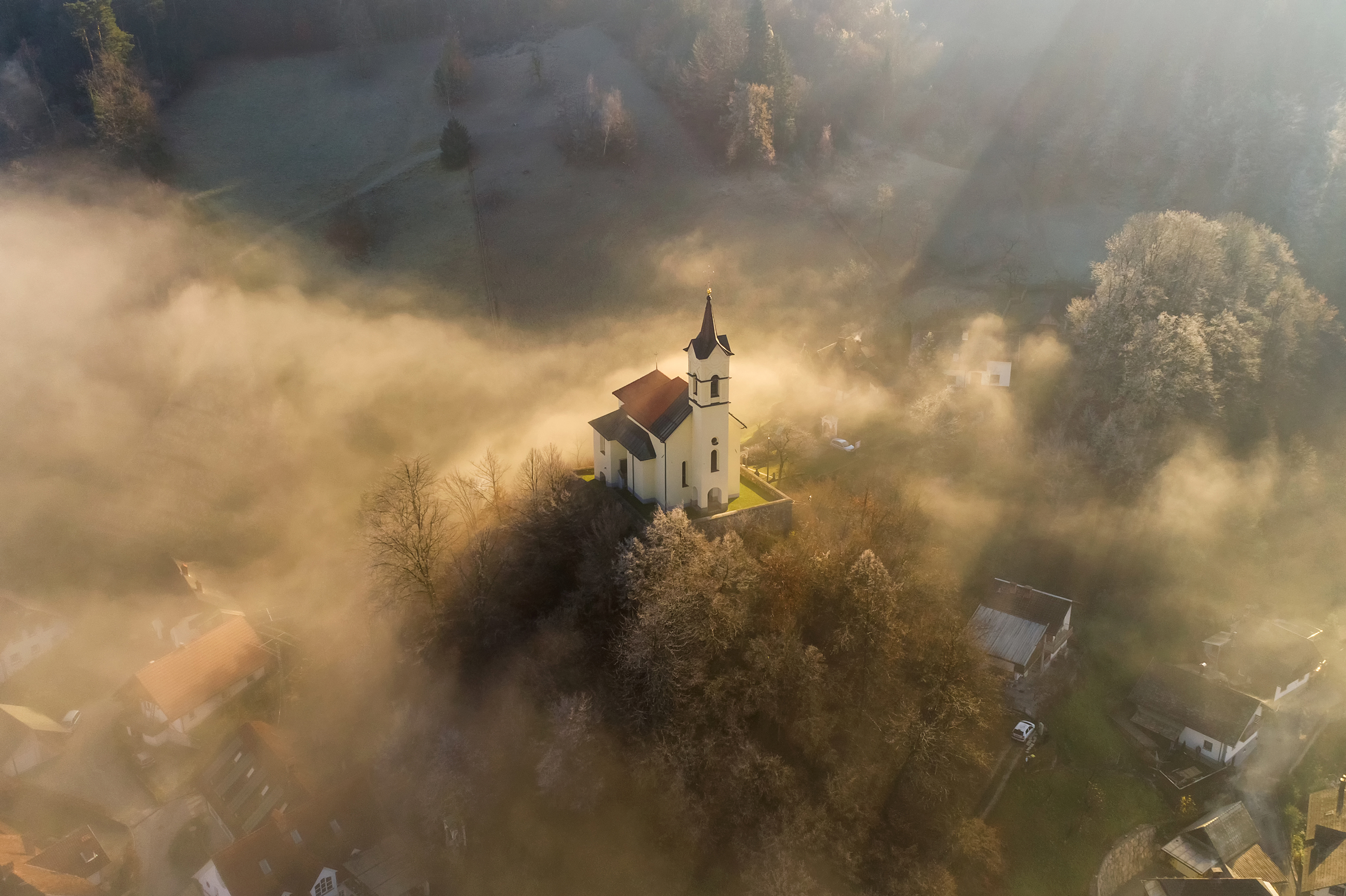 Church of the Holy Cross in the mystical morning sunbeams through autumn fog. Church of the Holy Cross is in the northwestern part of Slovenia on hill ab