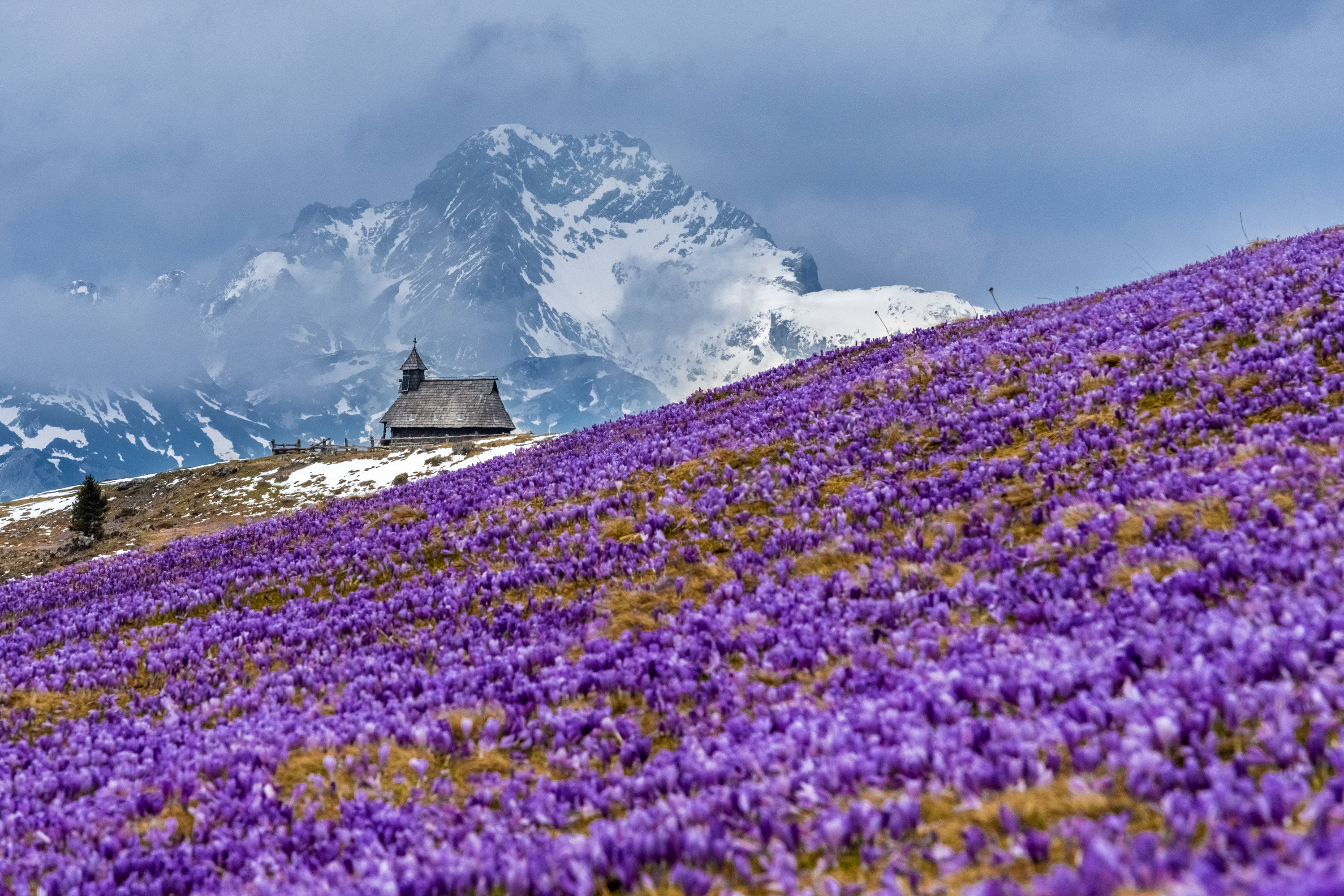Chapel Mary of the Snows on Velika Planina in spring among flowering saffron in front of big mountains in snow. The Big Pasture Plateau (Velika Planina) is