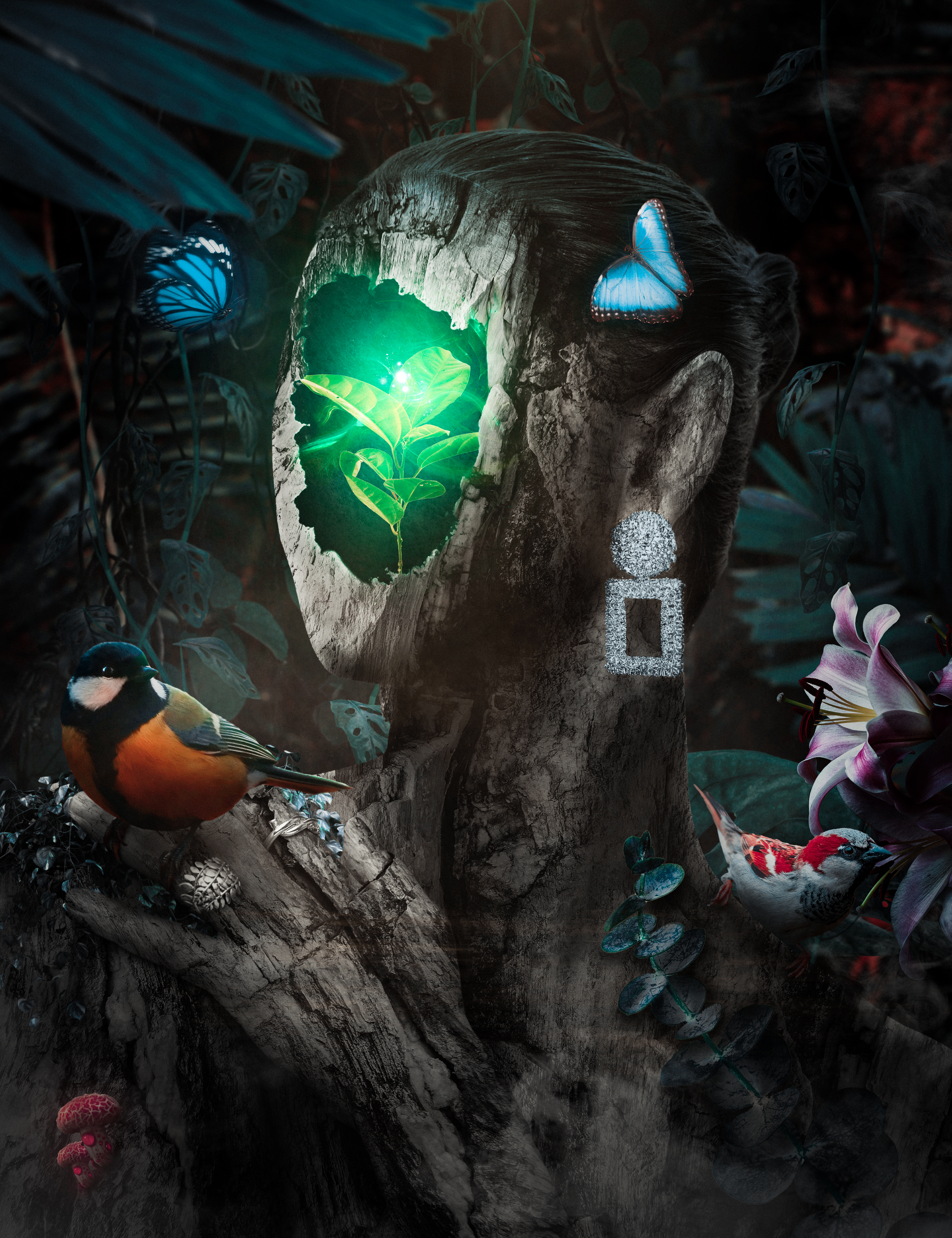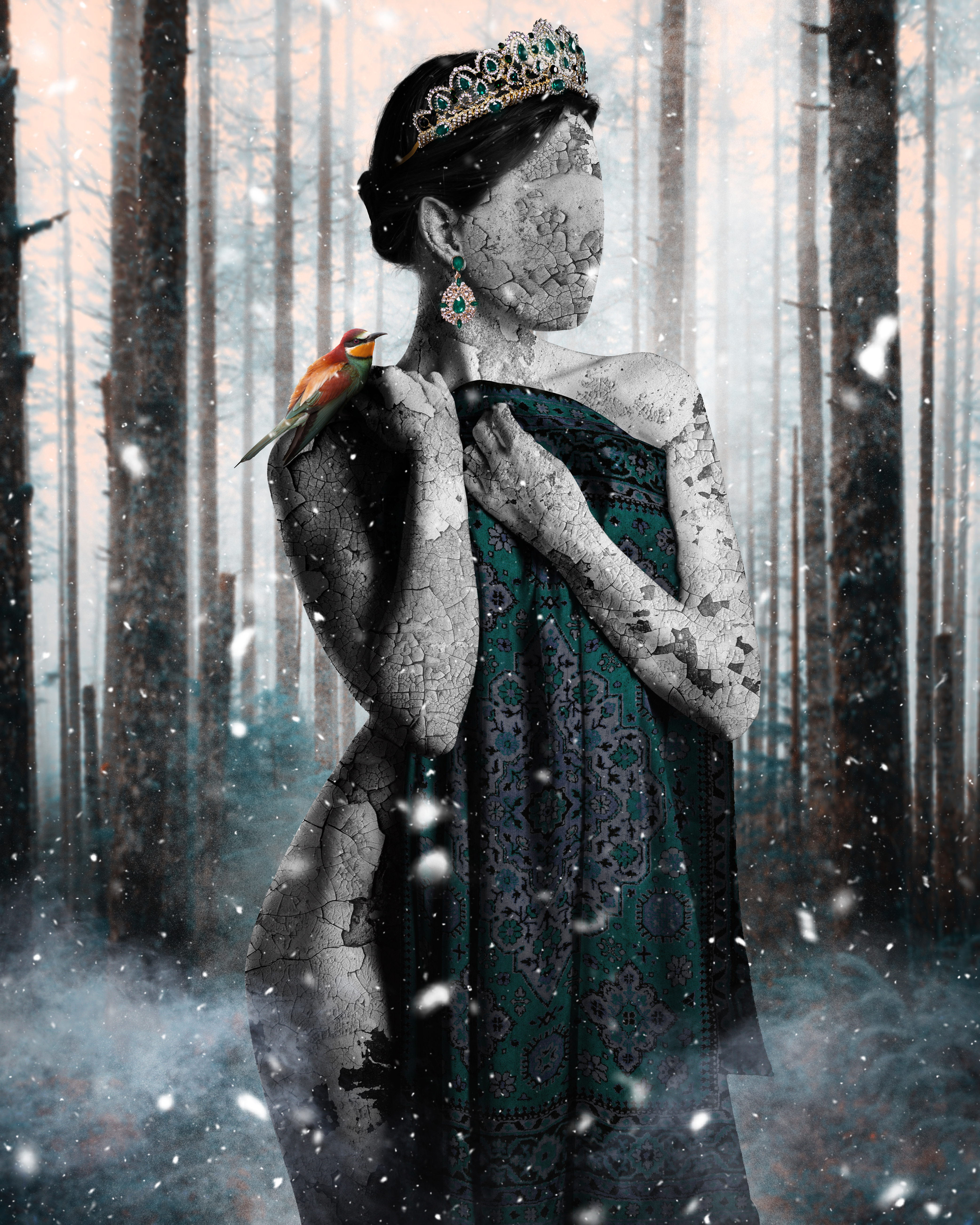 Snowflakes enter to the depth of the jungle slowly. A soothing cold can be felt. Peace in the cold of her existence can be felt from her cracked skin indee