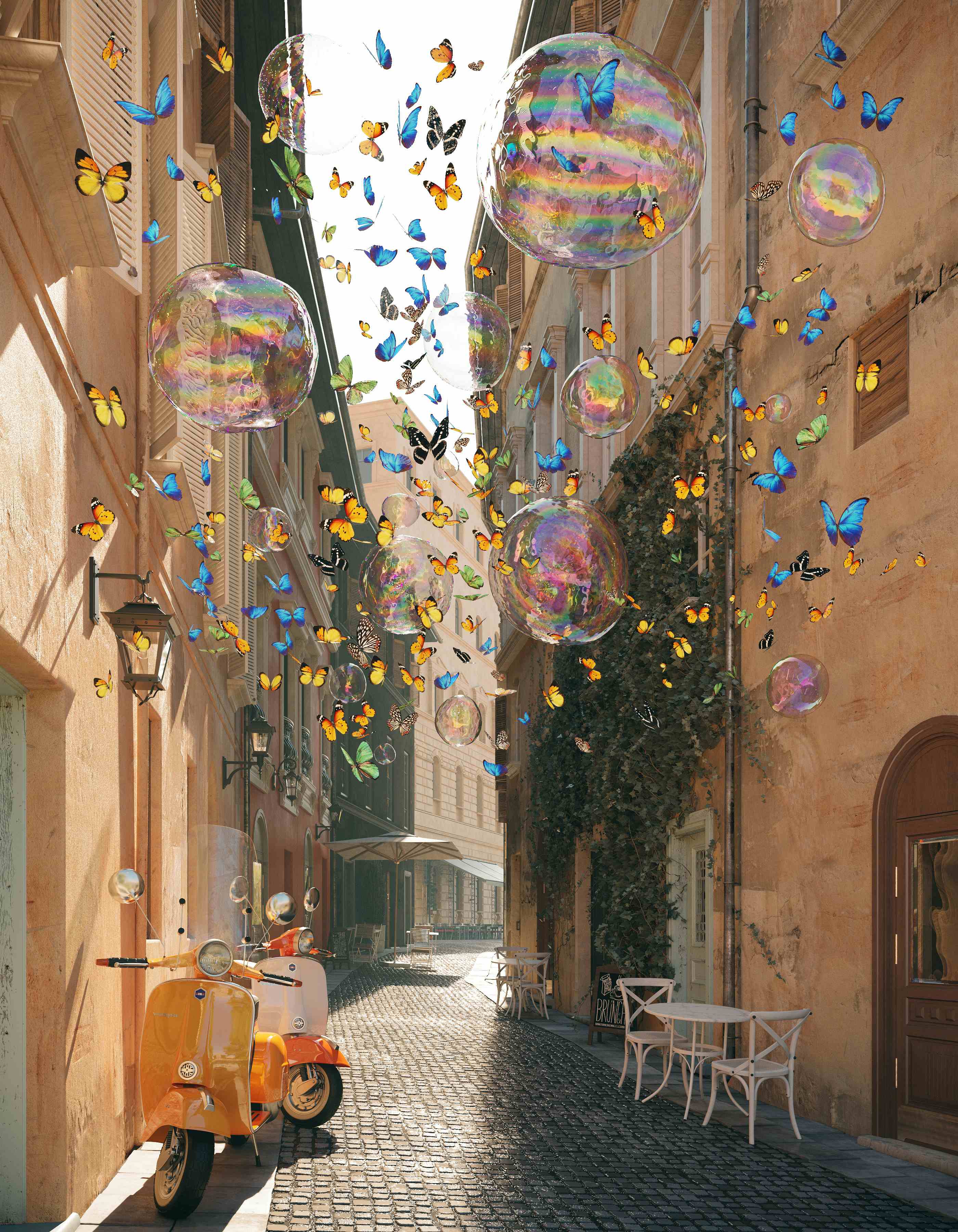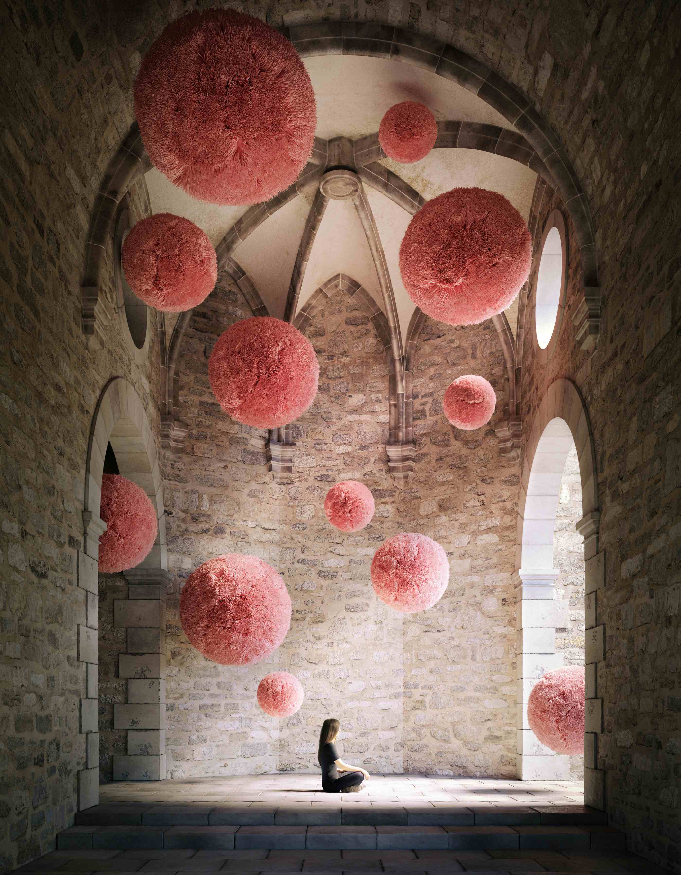 The moment when reality fades away, retreats, the wet and heavy leaves of palm trees move apart, opening the way. A soft light envelops stone steps and exo