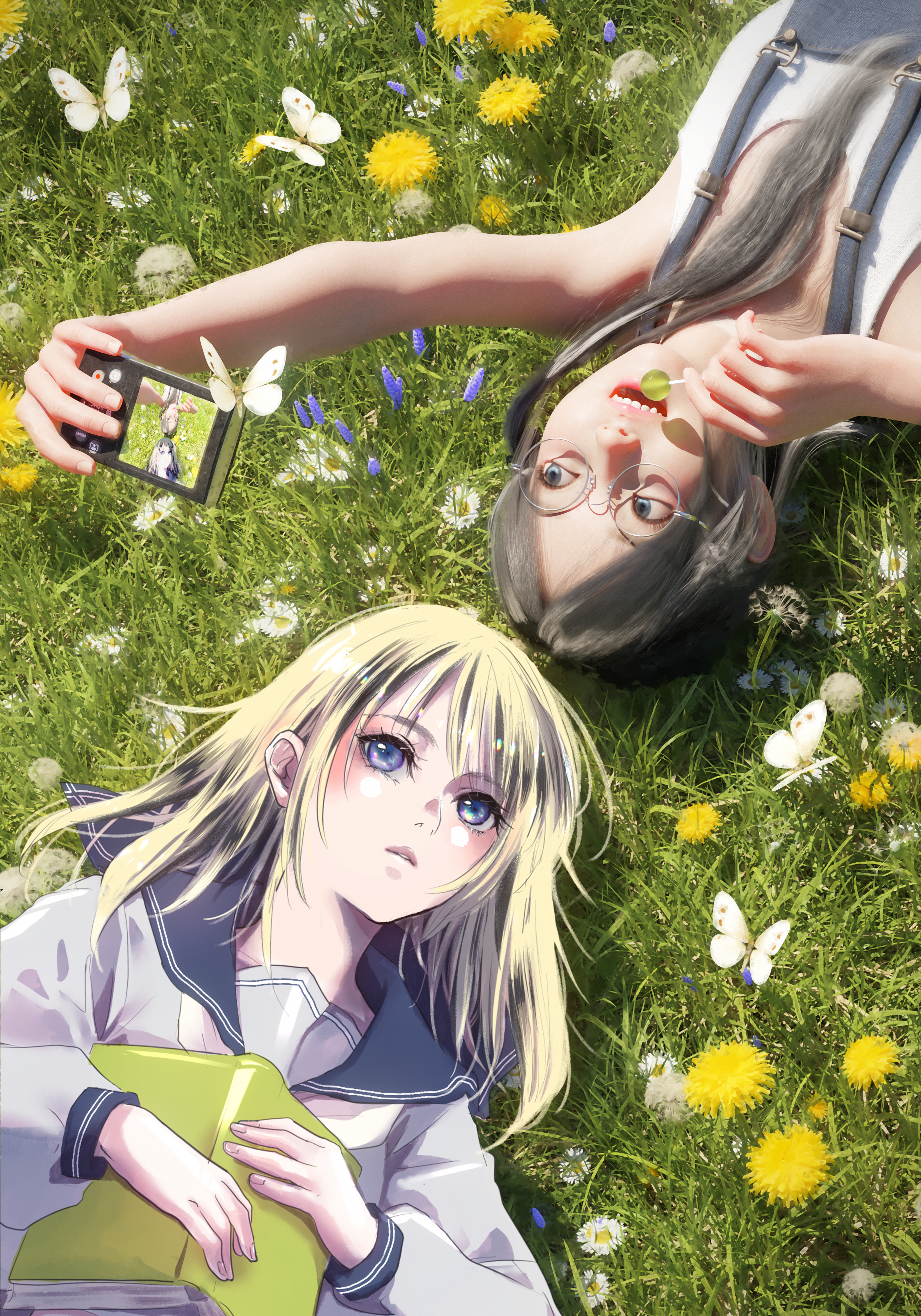 2D&3D carefree girlfriends relaxing in a warm meadow, harmonizing with cute butterflies. International artist collaboration: RVRE and Kaede-Karhedail!
