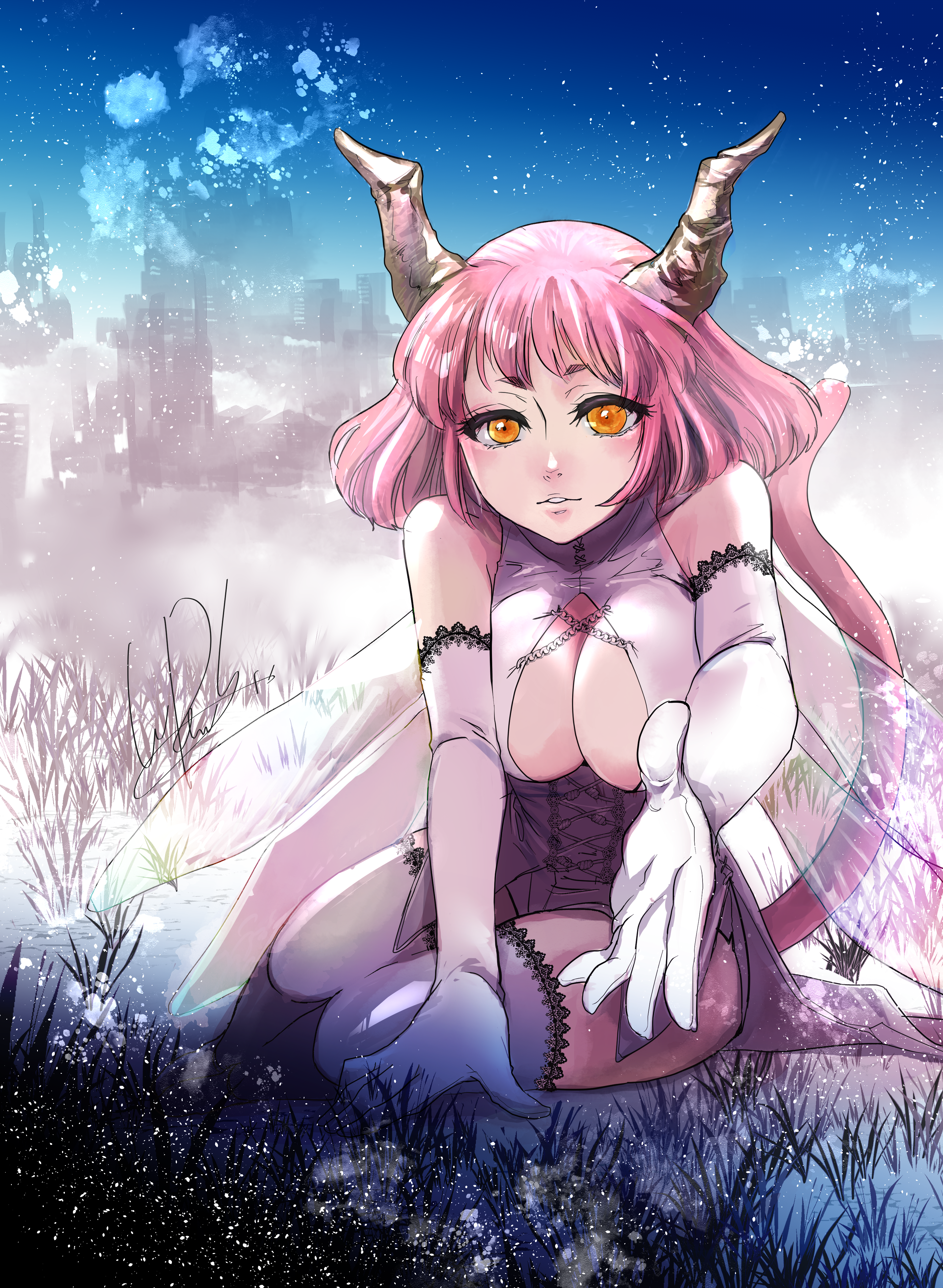 You are hiding behind the grass. This is a dense place. You are anxious and wondering what to do, when a mysterious girl with horns and wings appears. She
