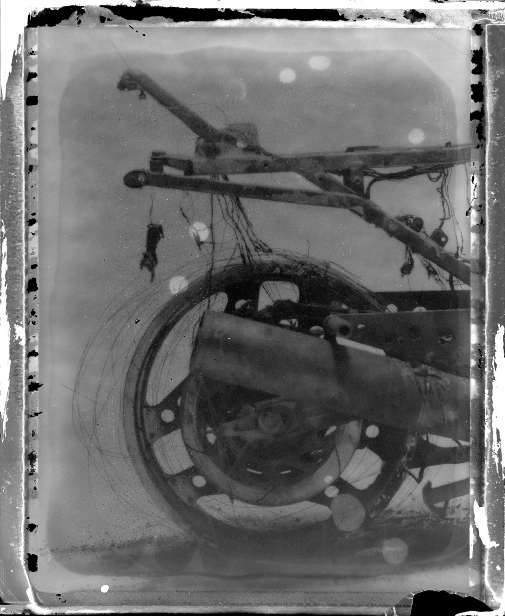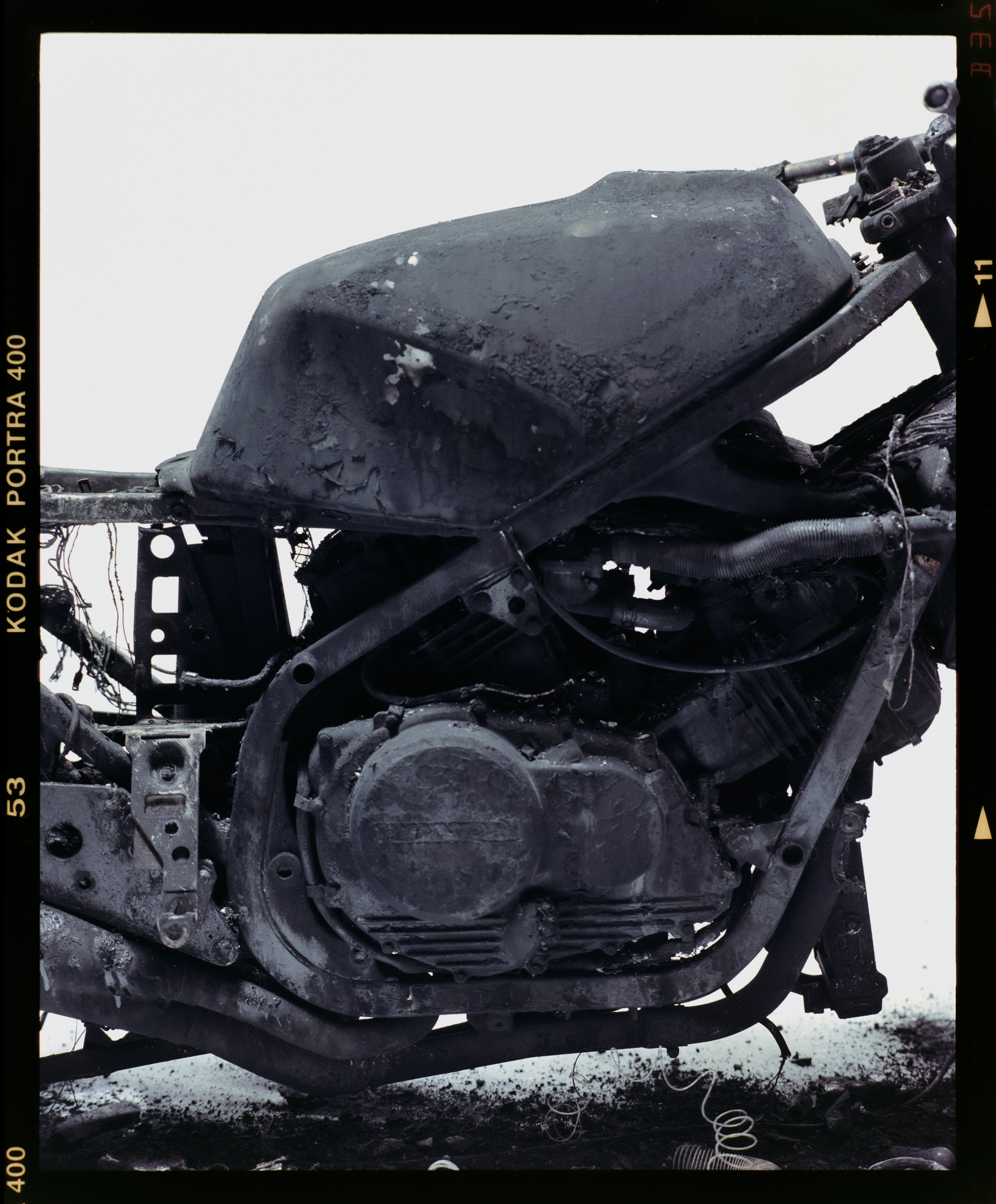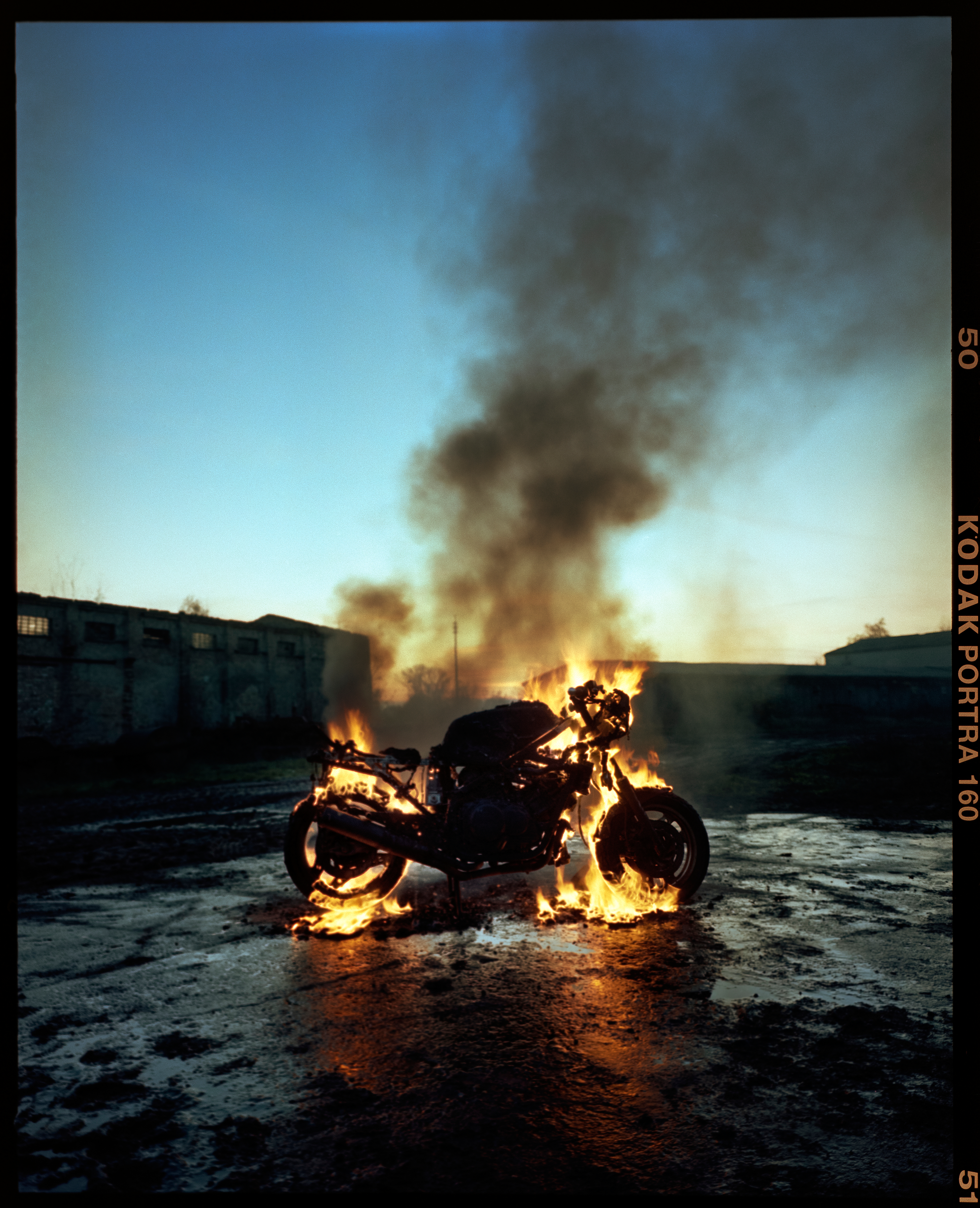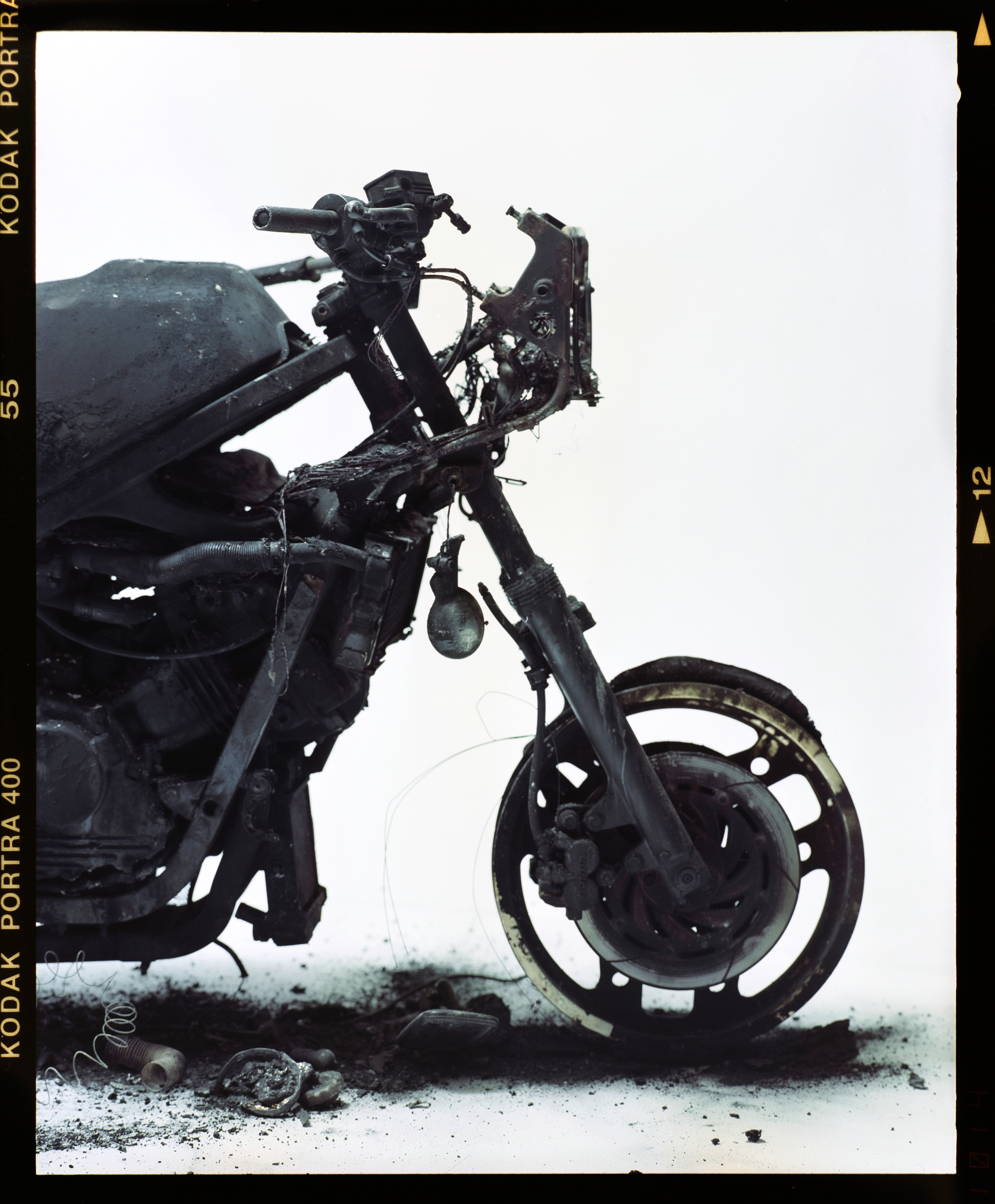After we took the burnt-down bike into the studio, I photographed it´s parts with a medium format film camera. It was the perfect way to capture all the de